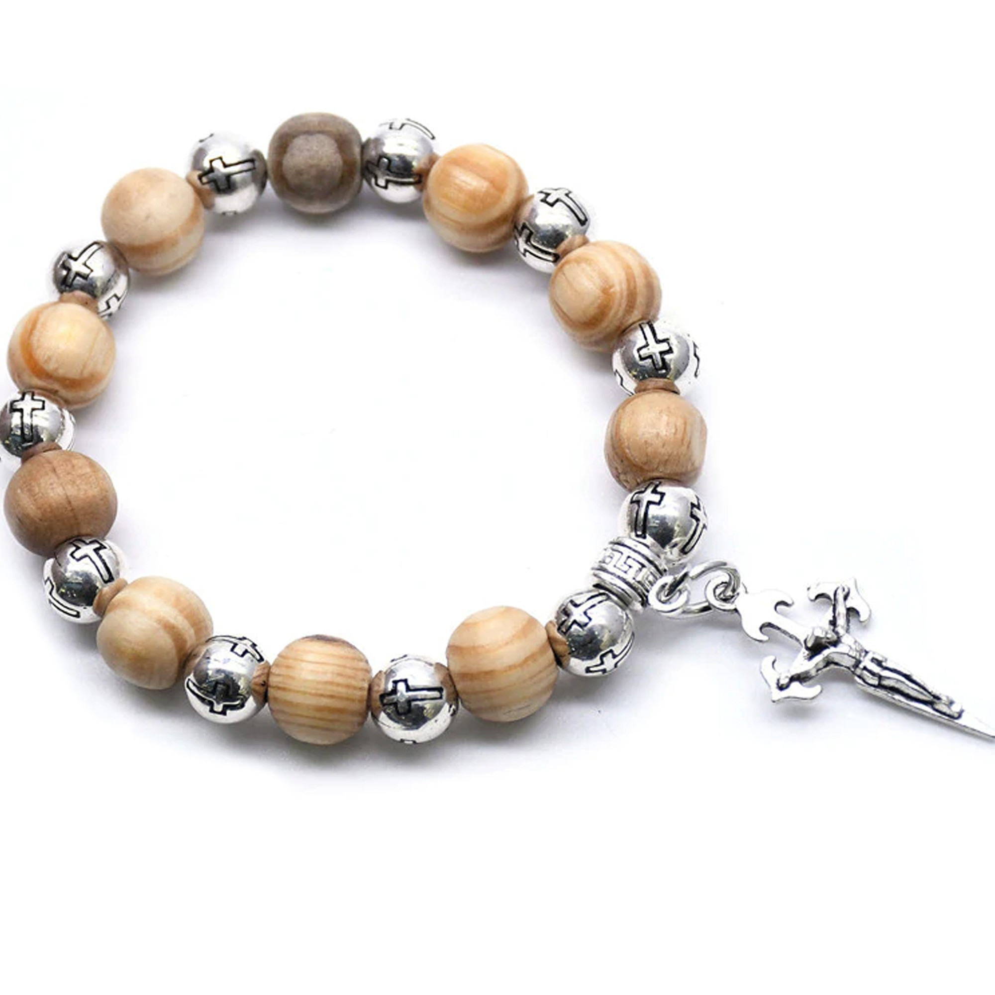Drevený náramok-ruženec (olivové drevo ) s krížikom Ježiša Krista a postriebrenými korálkami s krížikom. Náramok je na gumičku, takže ho jednoducho prevlečiete cez ruku.