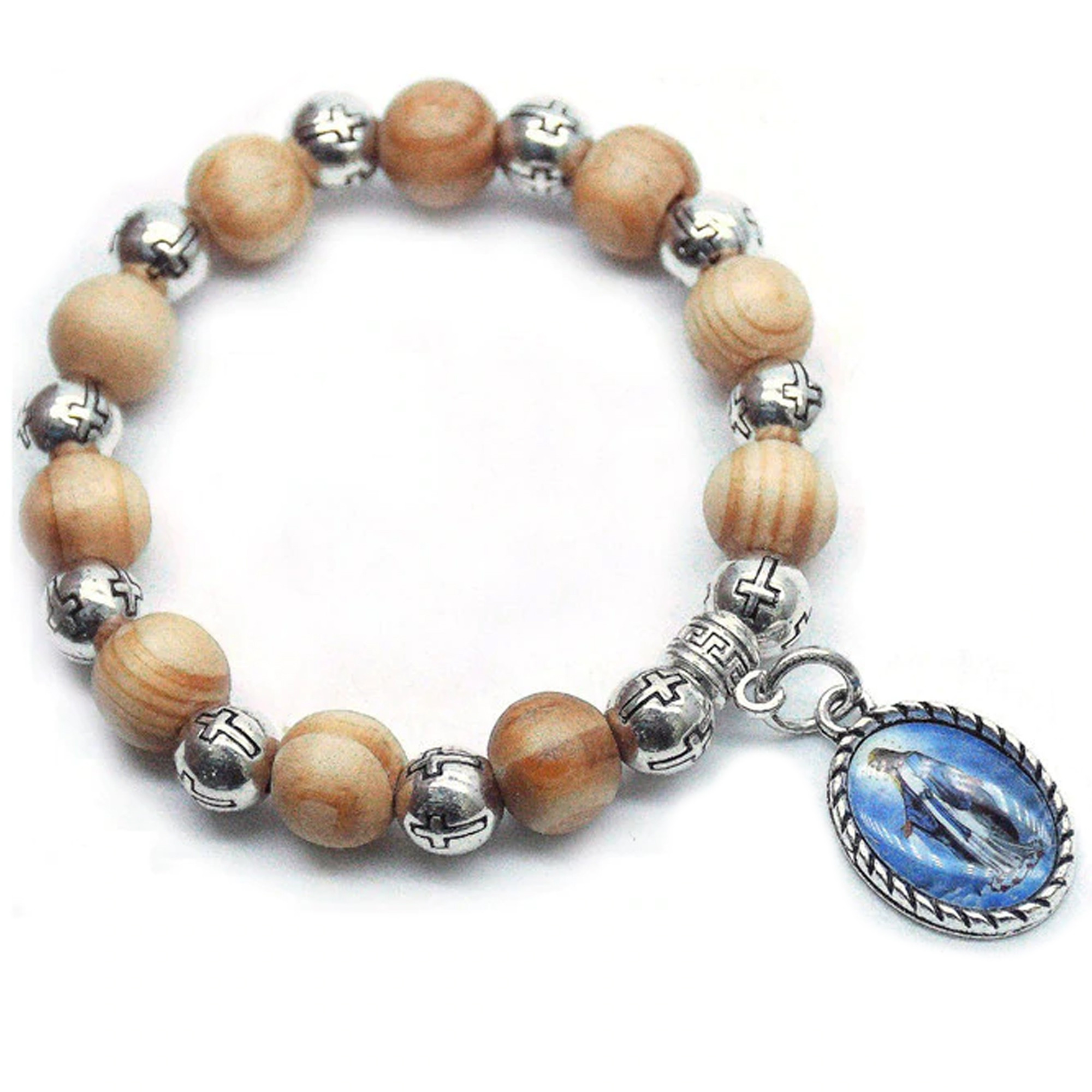 Drevený náramok-ruženec (olivové drevo ) s medailou Zázračnej Panny Márie a postriebrenými korálkami s krížikom. Náramok je na gumičku, takže ho jednoducho prevlečiete cez ruku.