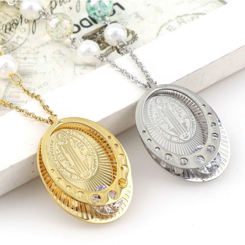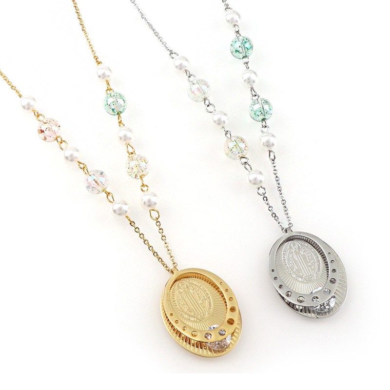 Kovový medailónik zlatej farby veľmi originálneho tvaru, ktorý zdobí ligotavý číry krištáľ. Retiazka je zdobená lesklými korálkami, ktoré dodávajú šperku celkový šmrnc a eleganciu.