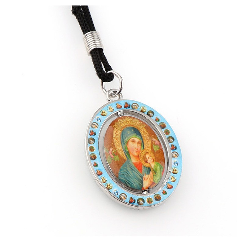 Rhodiovaný medailónik zaliaty glazúrou s náboženským motívom oválneho tvaru s vyobrazením Panny Márie. Medailón visí na čiernej bavlnenej šnúrke.
