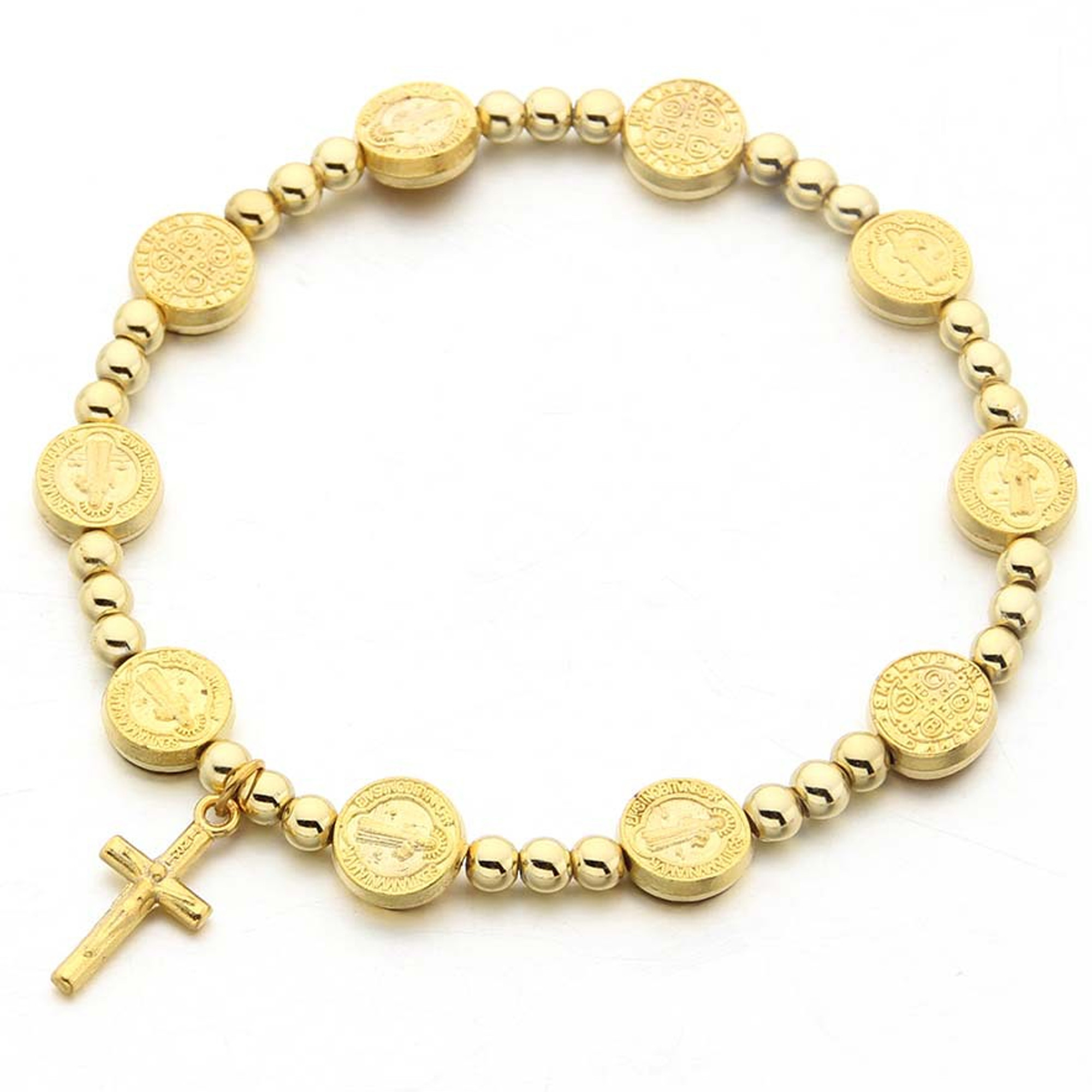 Kovocý náramok zlatej farby s náboženským motívom, z ktorého visí krížik. Náramok je na gumičku, takže ho ľahko prevlečiete cez ruku a prispôsobí sa každej veľkosti zápästia.
