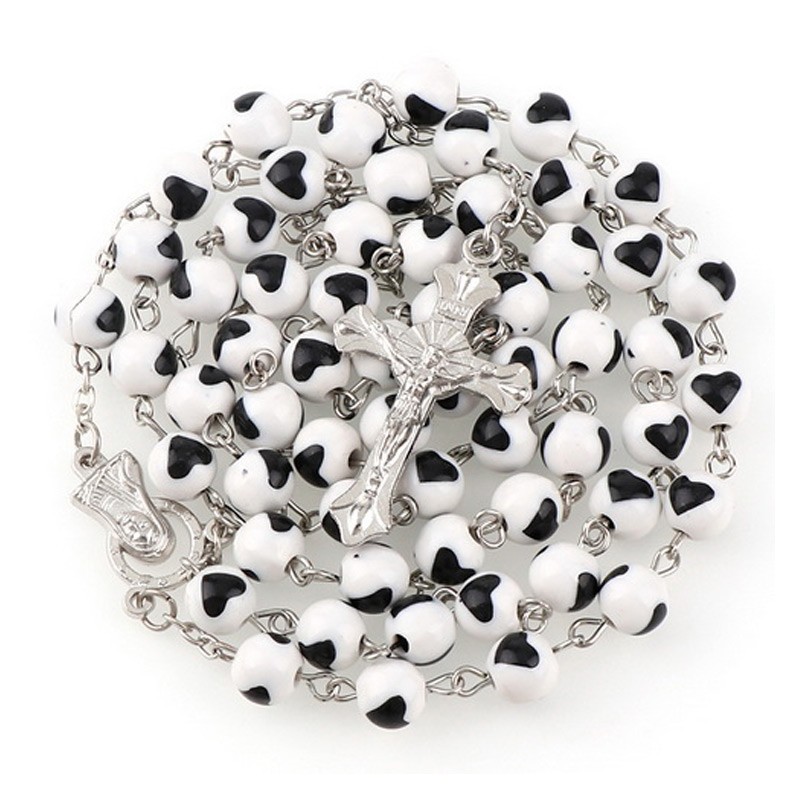 Postriebrený náhrdelník- ruženec, pospájané korálky čierno-bielej...