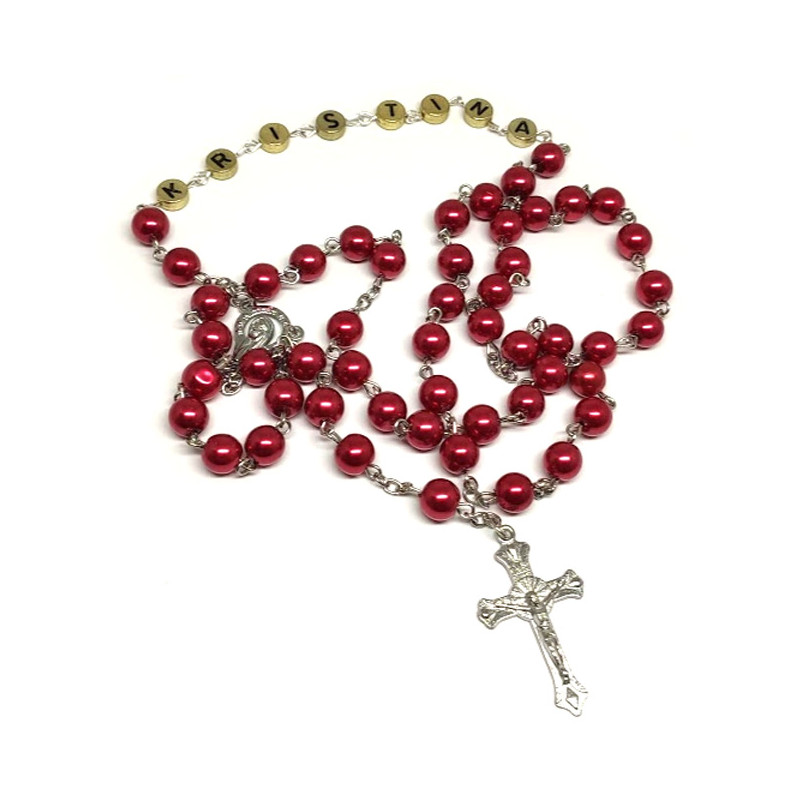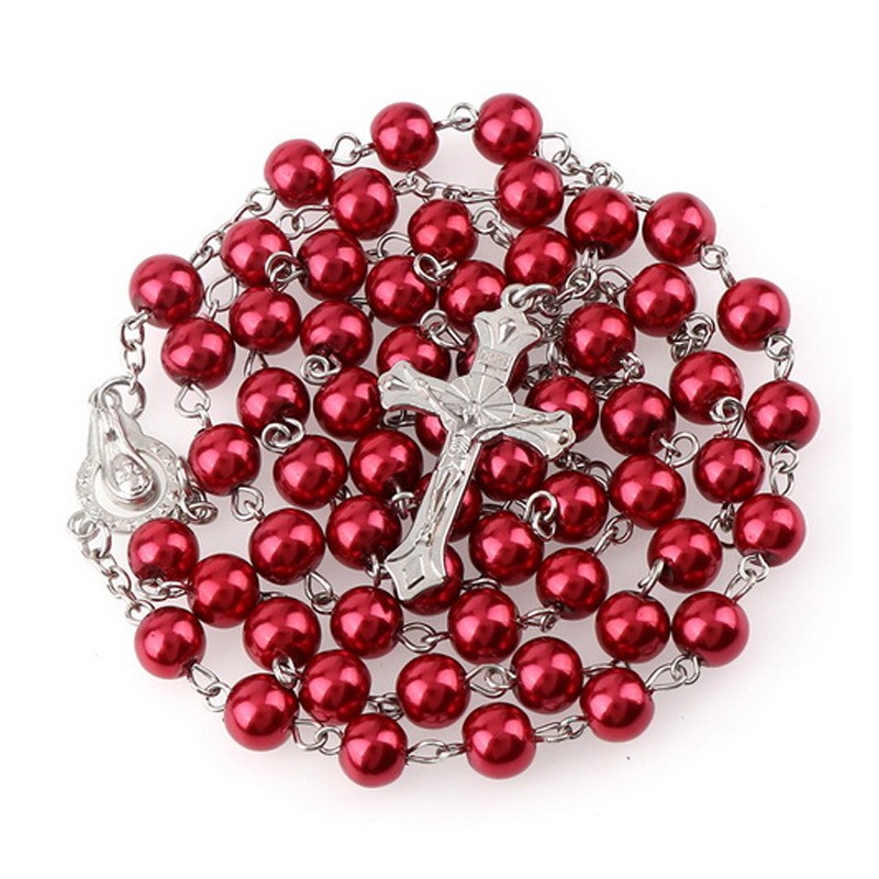 Postriebrený ruženec, ktorý je pospájaný korálkami červenej farby....