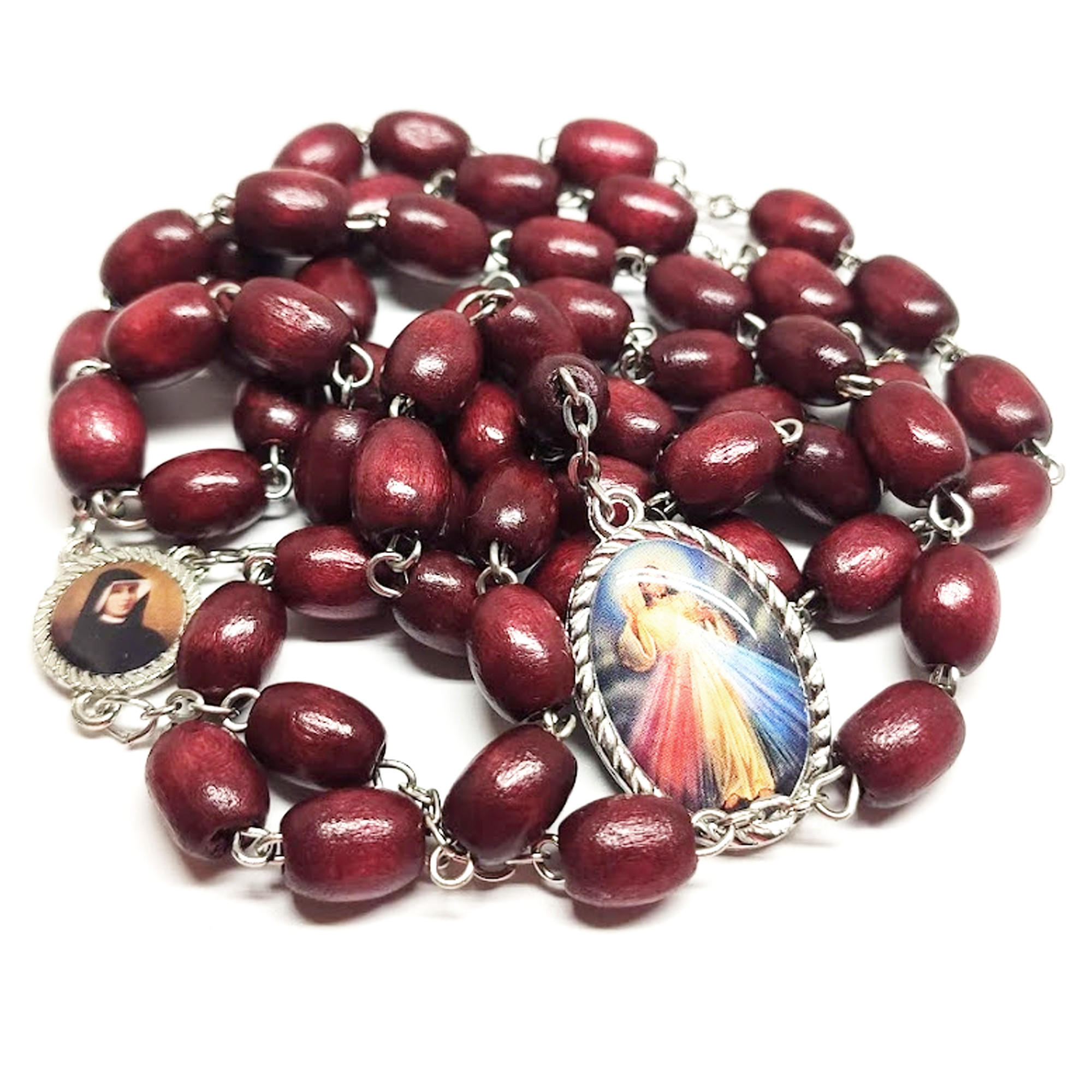 Ruženec, pospájané drevné korálky hnedočervenej farby. V spodnej časti ruženca visí medailón Božieho milosrdenstva.  Podľa želania Vám vieme vyrobiť ruženec aj na mieru podľa zvolených korálok, ktoré si vyberiete. Na jeden ruženec je možné vyrobiť vždy iba jedno meno alebo meno s číslicami podľa typu korálok.