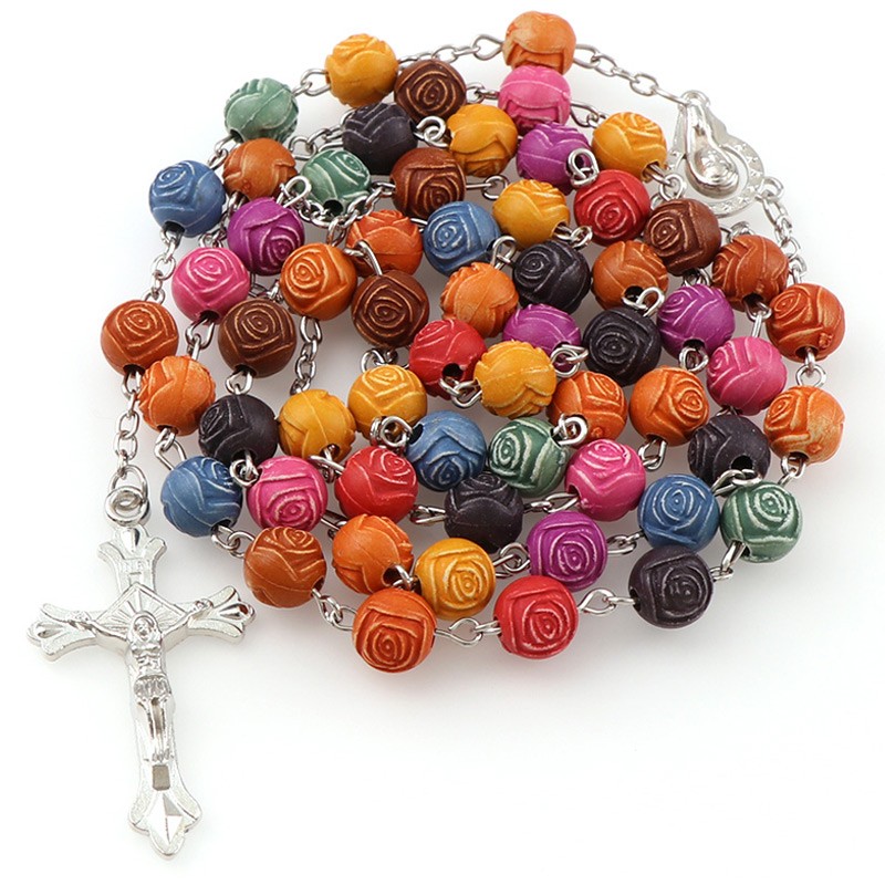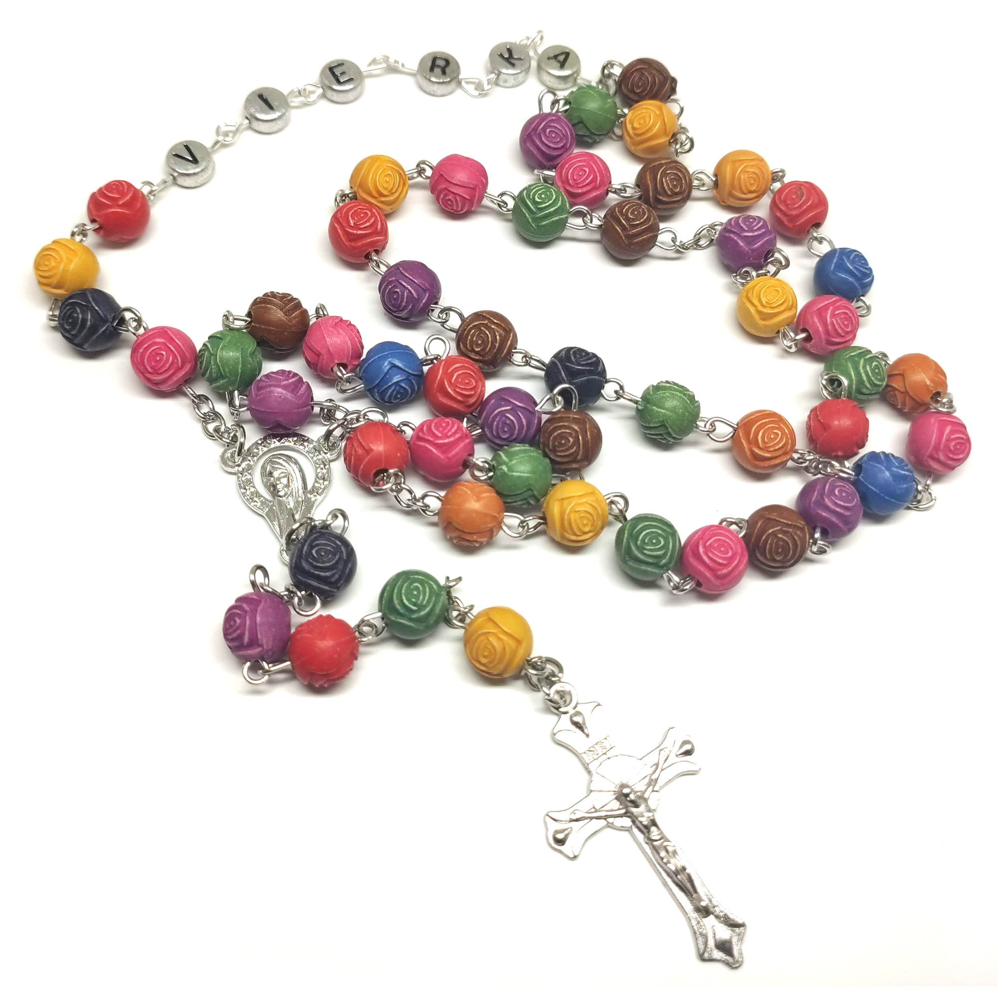 Postriebrený náhrdelník ruženec, pospájané farebné korálky, ktoré zdobia vygravírované ružičky. V spodnej časti ruženca je upevnený krížik Ježiša Krista. Podľa želania Vám vieme vyrobiť ruženec aj na mieru podľa zvolených korálok, ktoré si vyberiete. Na jeden ruženec je možné vyrobiť vždy iba jedno meno alebo meno s číslicami podľa typu korálok.