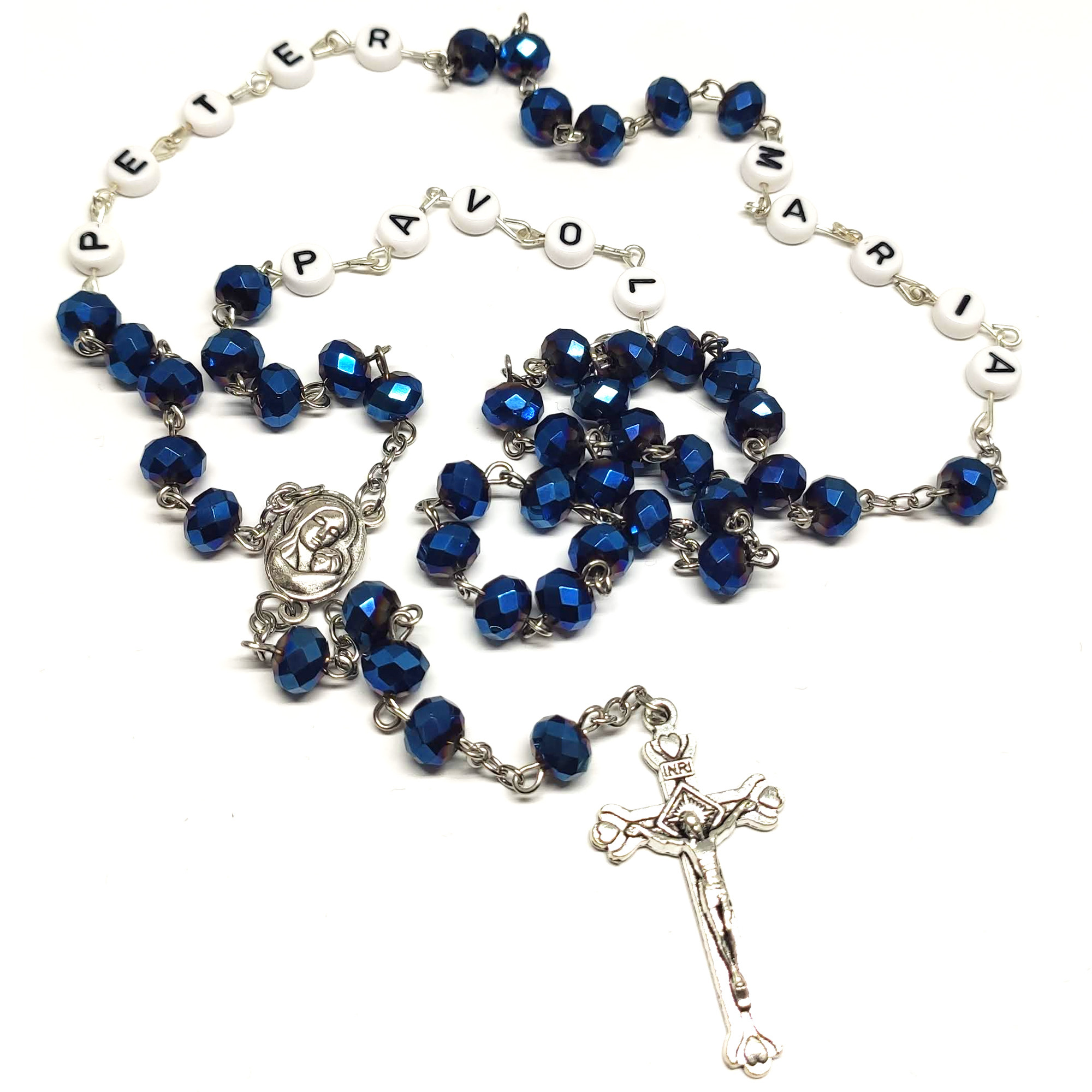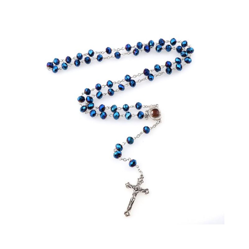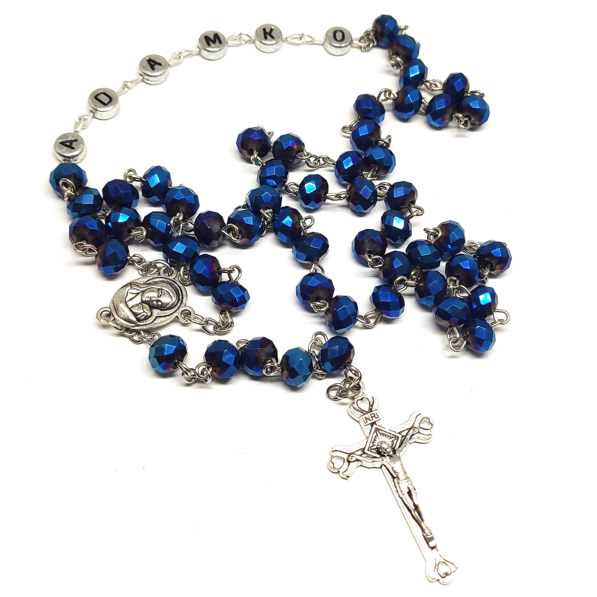 Ruženec, ktorý je pospájaný krištálikmi modrej farby. Náhrdelník zdobí aj obojstranný medailón zázračnej Panny Márie. V spodnej časti je upevnený krížik Ježiša Krista.  Podľa želania Vám vieme vyrobiť ruženec aj na mieru podľa zvolených korálok, ktoré si vyberiete. Na jeden ruženec je možné vyrobiť vždy iba jedno meno alebo meno s číslicami...