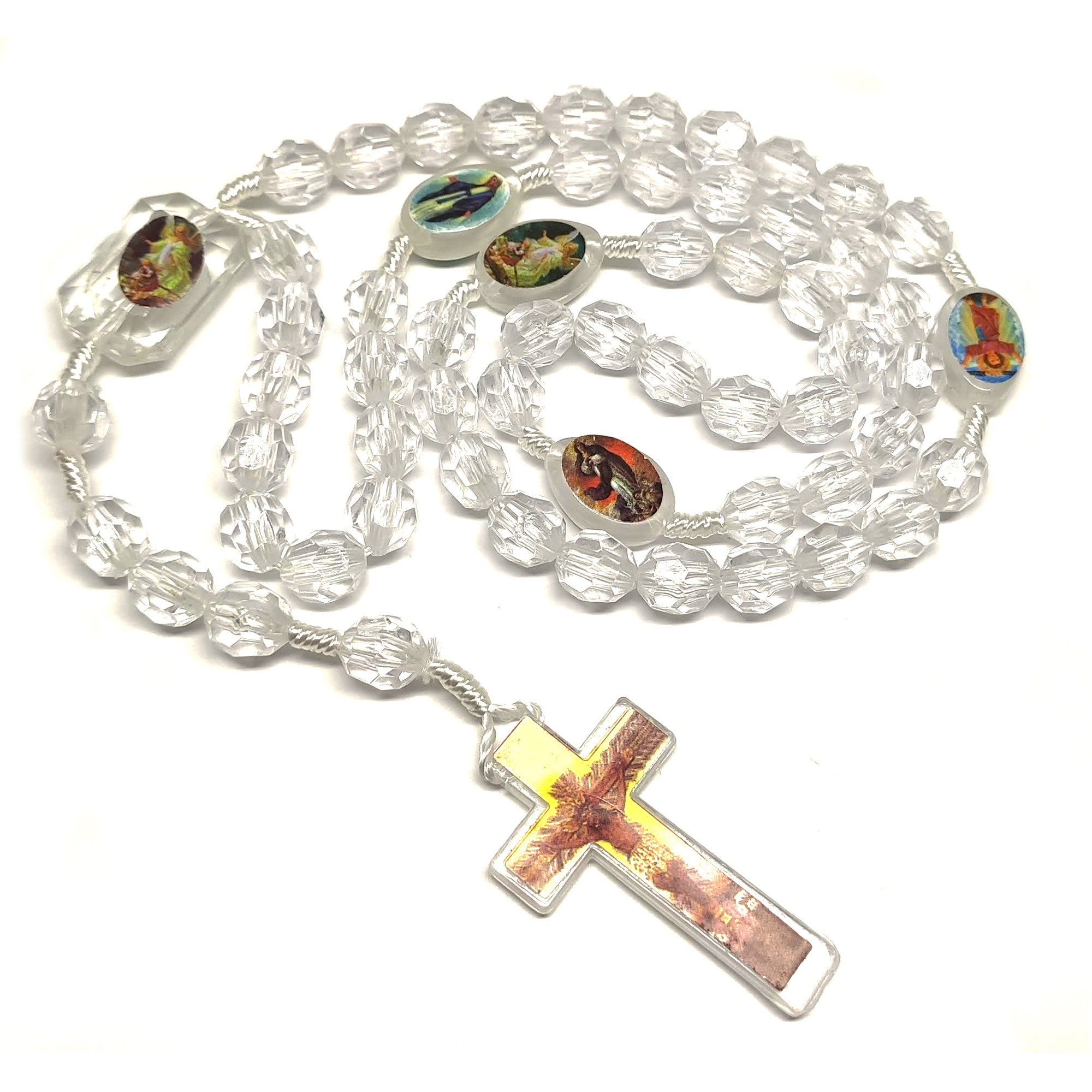 Korálkový ruženec na bavlnenej šnúrke s priehľadnými korálkami a svätými obrázkami. V spodnej časti ruženca visí krížik s vyobrazením Ježiša Krista.