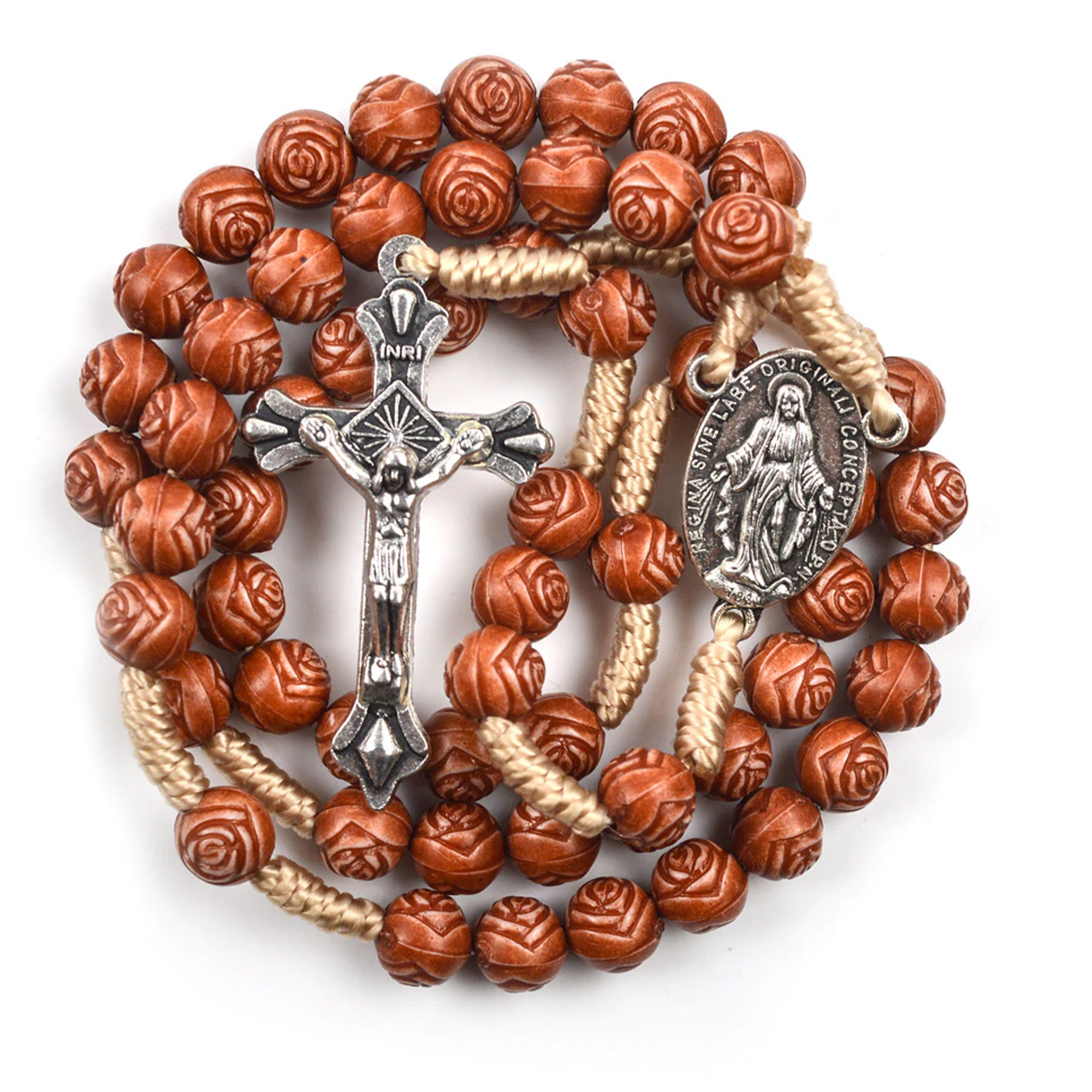 Ruženec na šnúrke pospájaný hnedými korálkami. V spodnej časti ruženca je upevnená medaila Zázračnej Panny Márie a krížik Ježiša Krista.