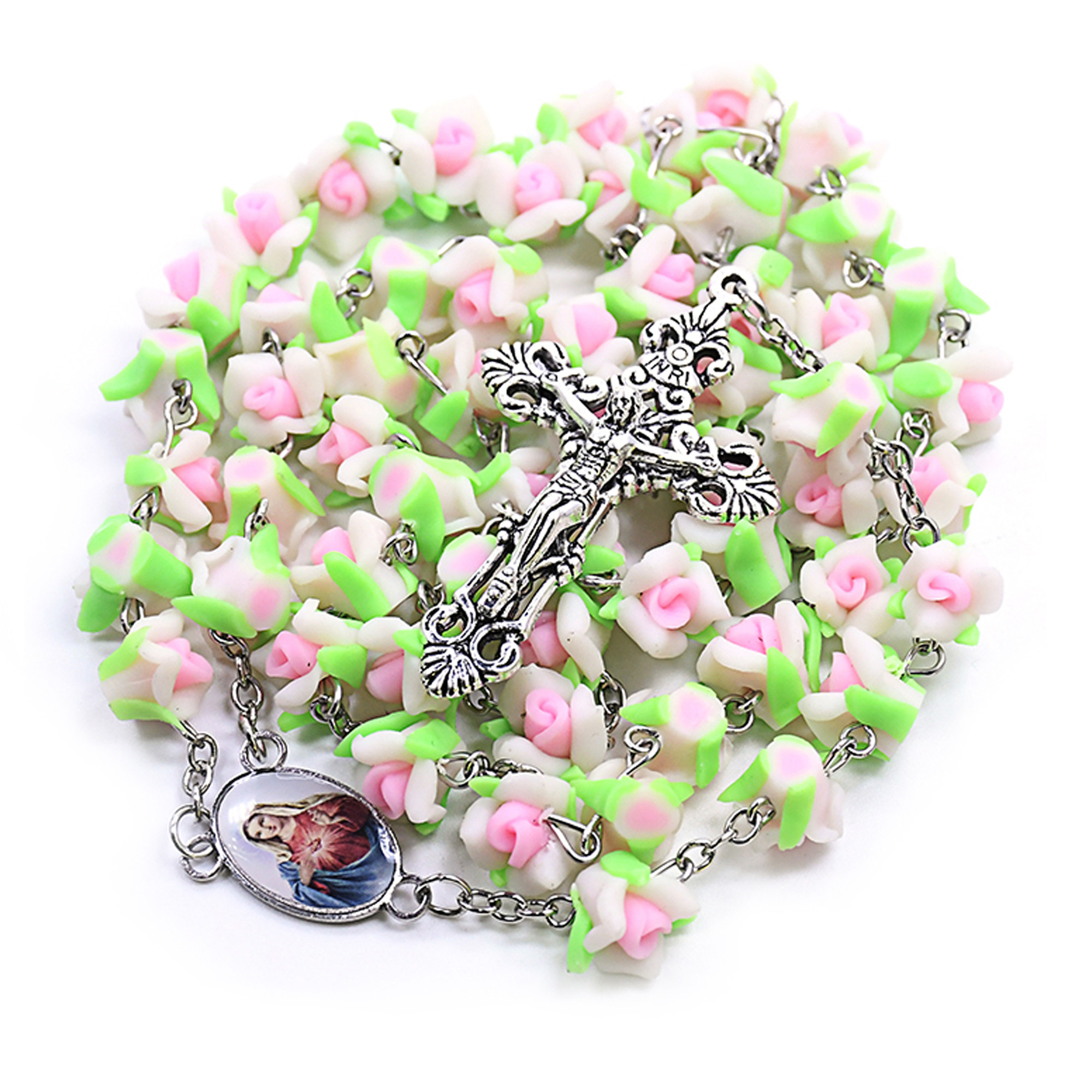 Jedinečný, nádherný ruženec, pospájané ružičky bielej farby. Z ruženca visí medailón Panny Márie a krížik Ježiša krista. Podľa želania Vám vieme vyrobiť ruženec aj na mieru podľa zvolených korálok, ktoré si vyberiete. Na jeden ruženec je možné vyrobiť vždy iba jedno meno alebo meno s číslicami podľa typu korálok.