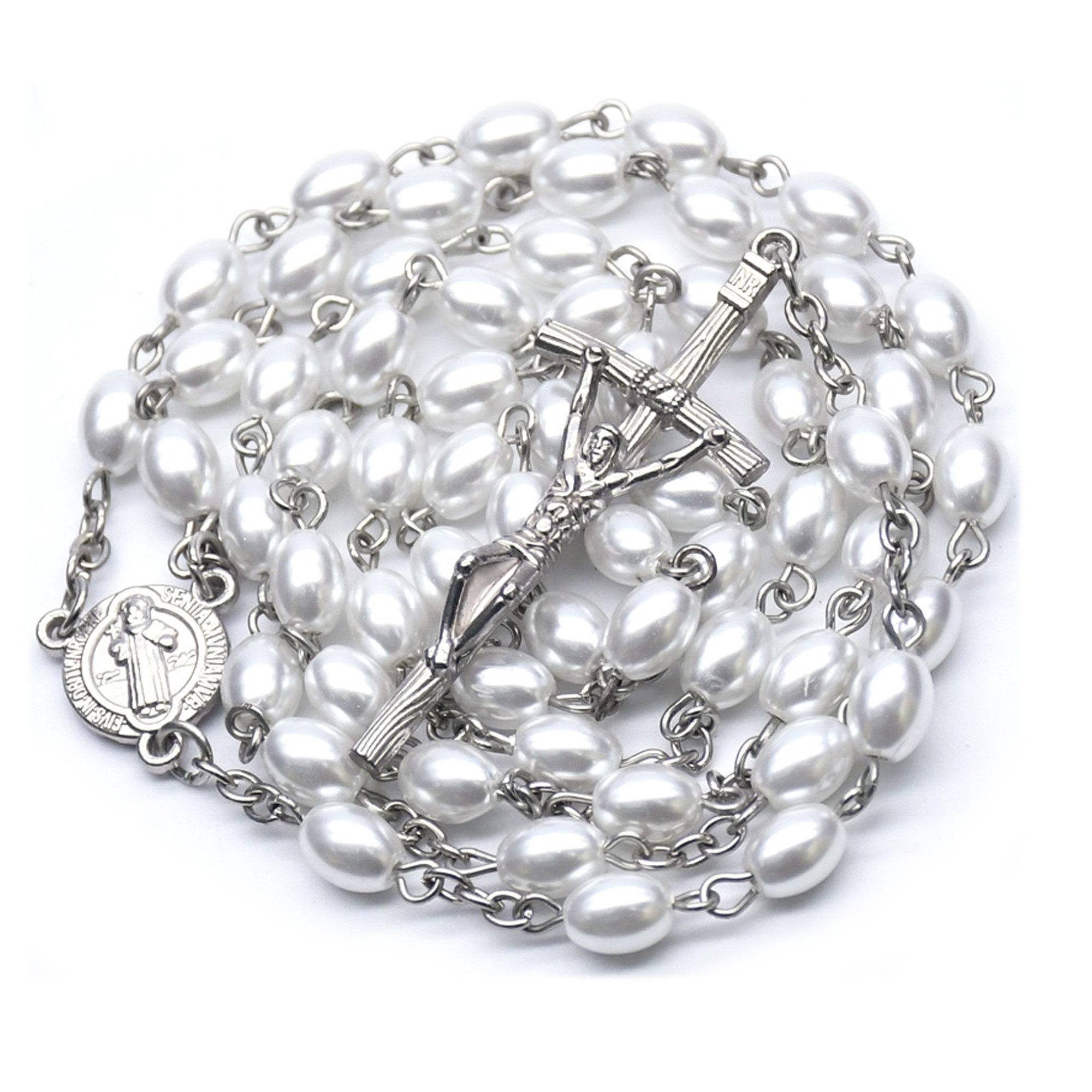 Náhrdelník ruženec, ktorý je pospájaný imitáciou perál bielej farby. V spodnej časti ruženca je upevnený medailón Sv.Benedikta a krížik Ježiša Krista.  Podľa želania Vám vieme vyrobiť ruženec aj na mieru podľa zvolených korálok, ktoré si vyberiete. Na jeden ruženec je možné vyrobiť vždy iba jedno meno alebo meno s číslicami podľa typu korálok.