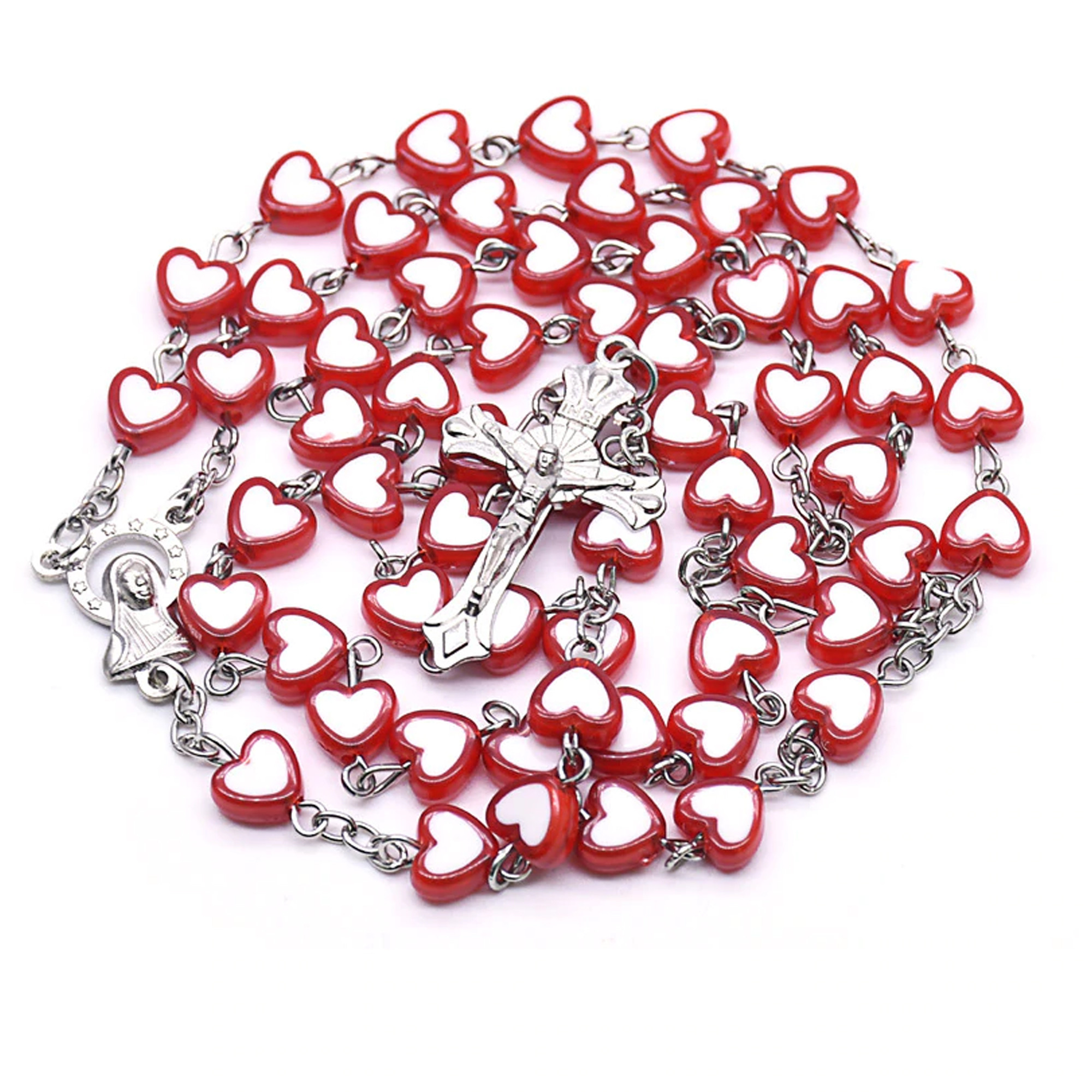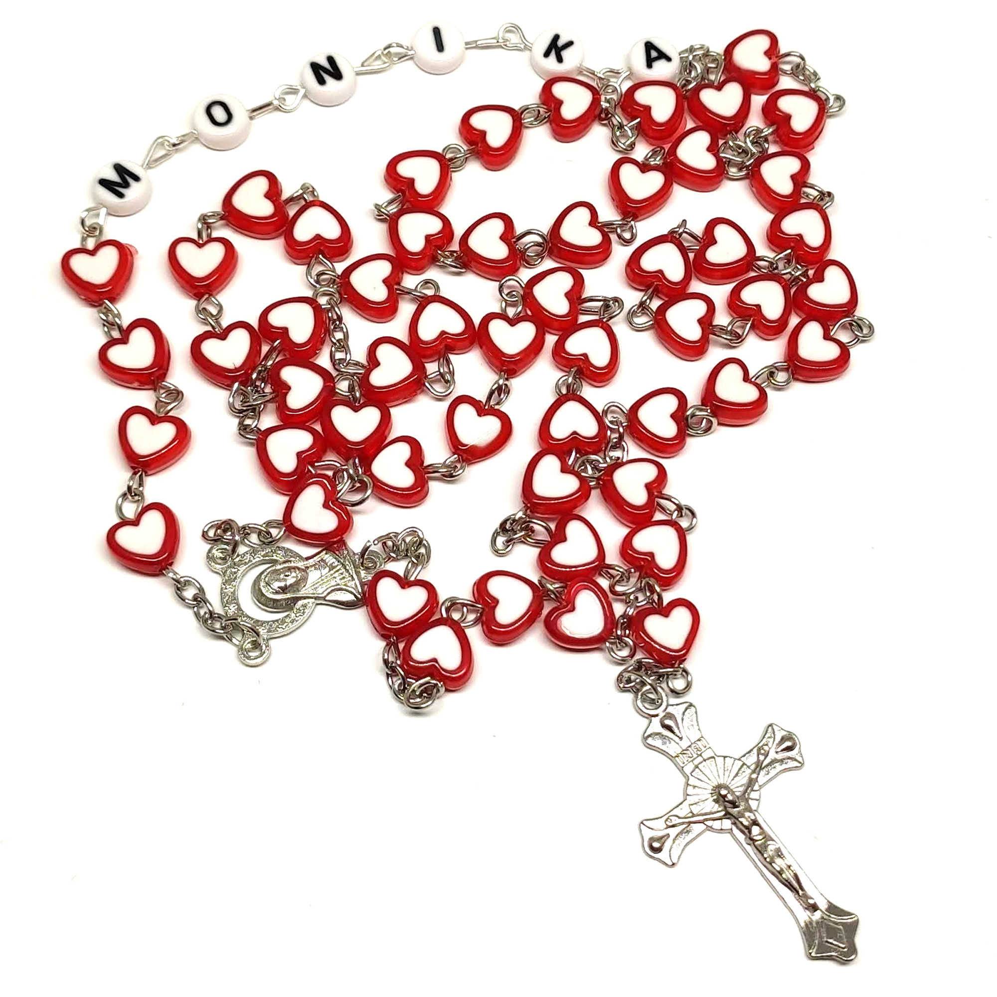 Postriebrený ruženec, ktorý je pospájaný korálkami červenej farby....