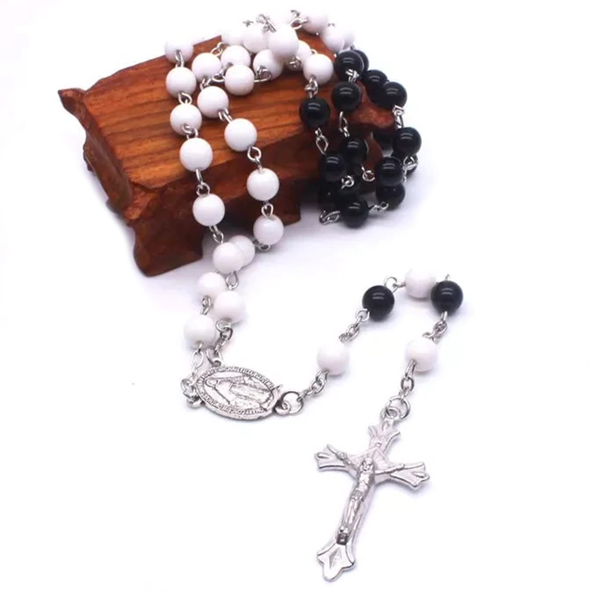Postriebrený ruženec, ktorý je pospájaný korálkami bielej farby s...