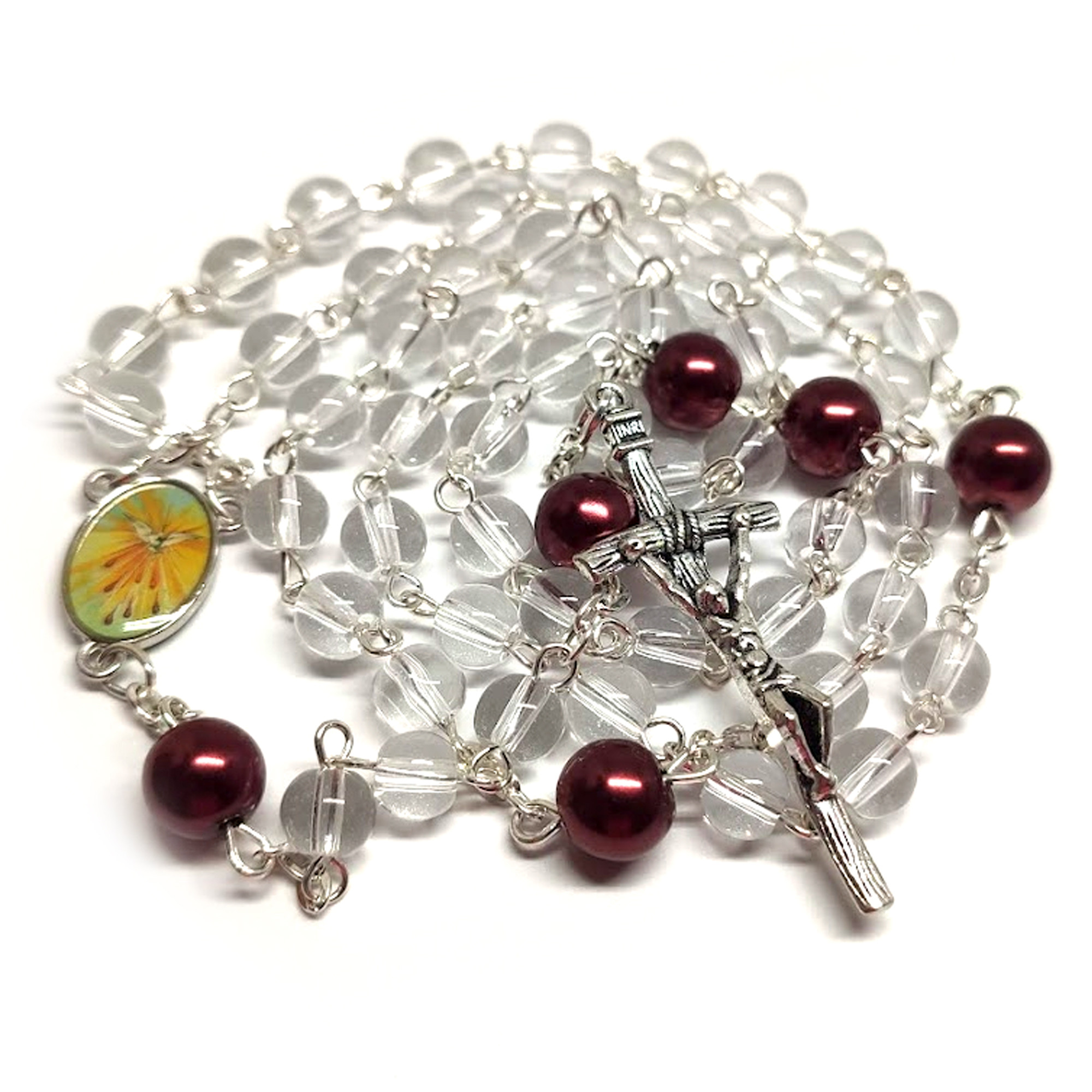 Ruženec, pospájané priehľadné korálky, každú modlitbu oddeľuje bordová syntetická perla. Z ruženca visí medailón ku duchu svätému a krížik Ježiša krista.  Podľa želania Vám vieme vyrobiť ruženec aj na mieru podľa zvolených korálok, ktoré si vyberiete. Na jeden ruženec je možné vyrobiť vždy iba jedno meno alebo meno s číslicami podľa typu korálok.