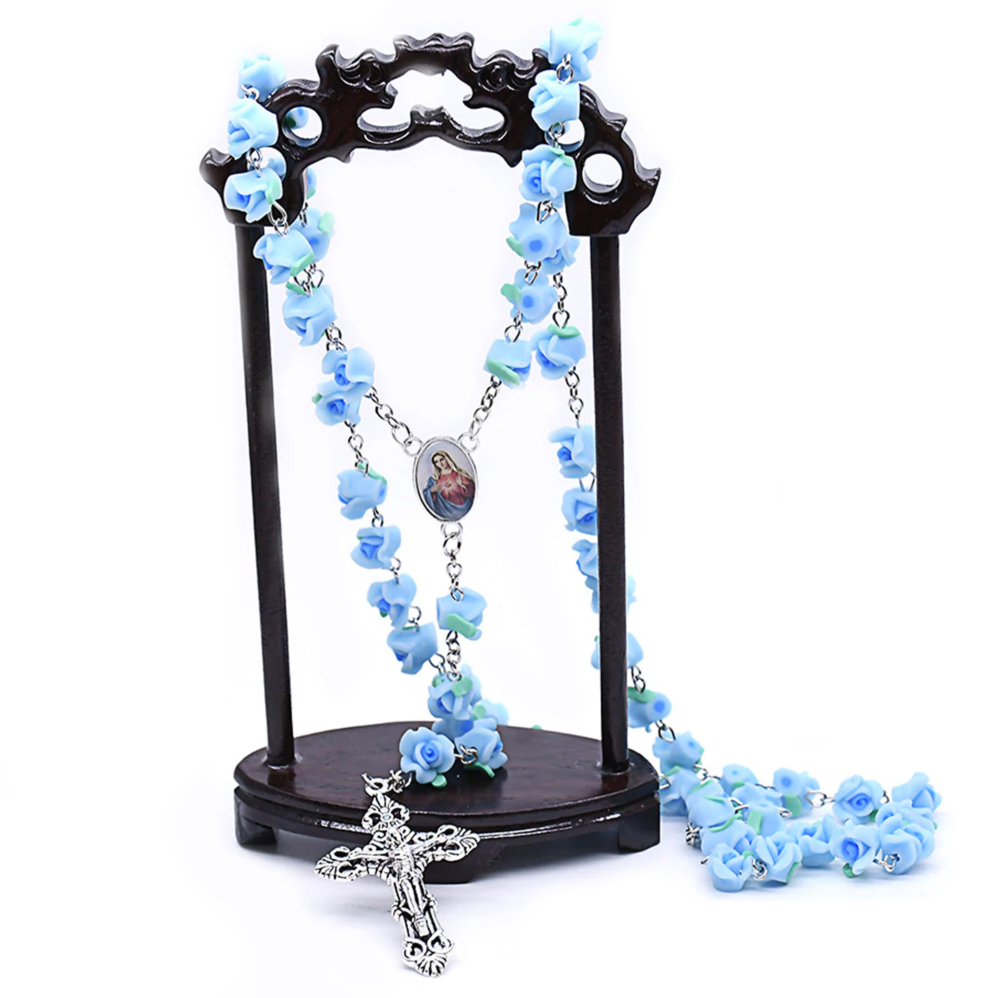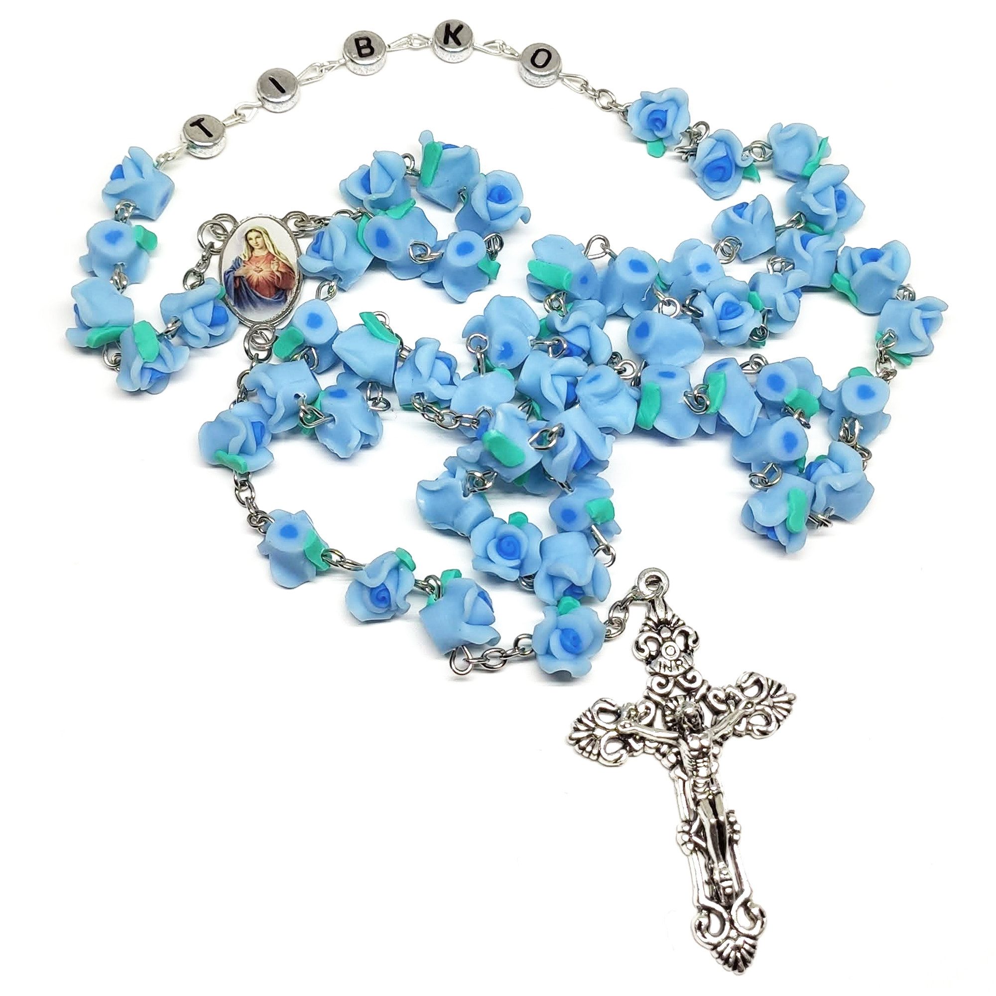 Jedinečný, nádherný ruženec, pospájané ružičky modrej farby. Z ruženca visí medailón Panny Márie a krížik Ježiša krista. Podľa želania Vám vieme vyrobiť ruženec aj na mieru podľa zvolených korálok, ktoré si vyberiete. Na jeden ruženec je možné vyrobiť vždy iba jedno meno alebo meno s číslicami podľa typu korálok.