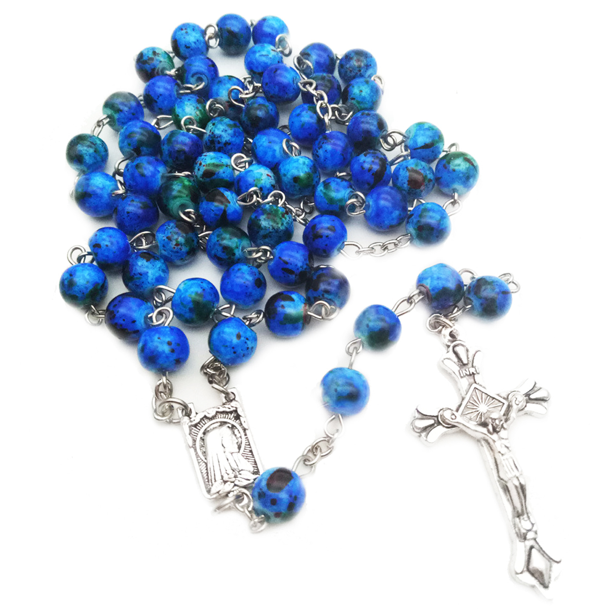 Postriebrený ruženec, ktorý je pospájaný korálkami modrej farby s...