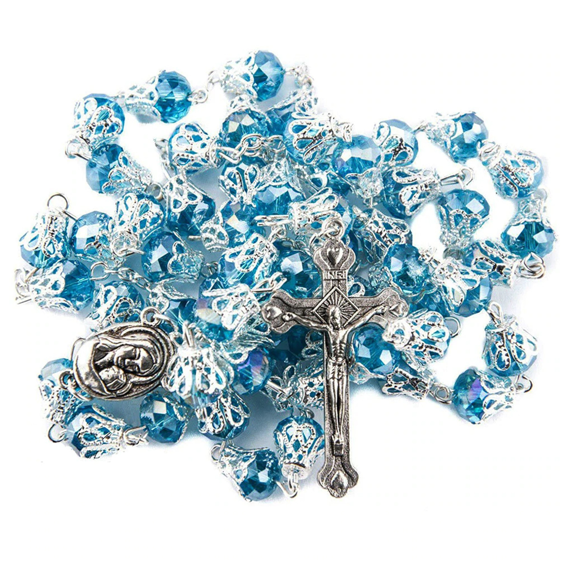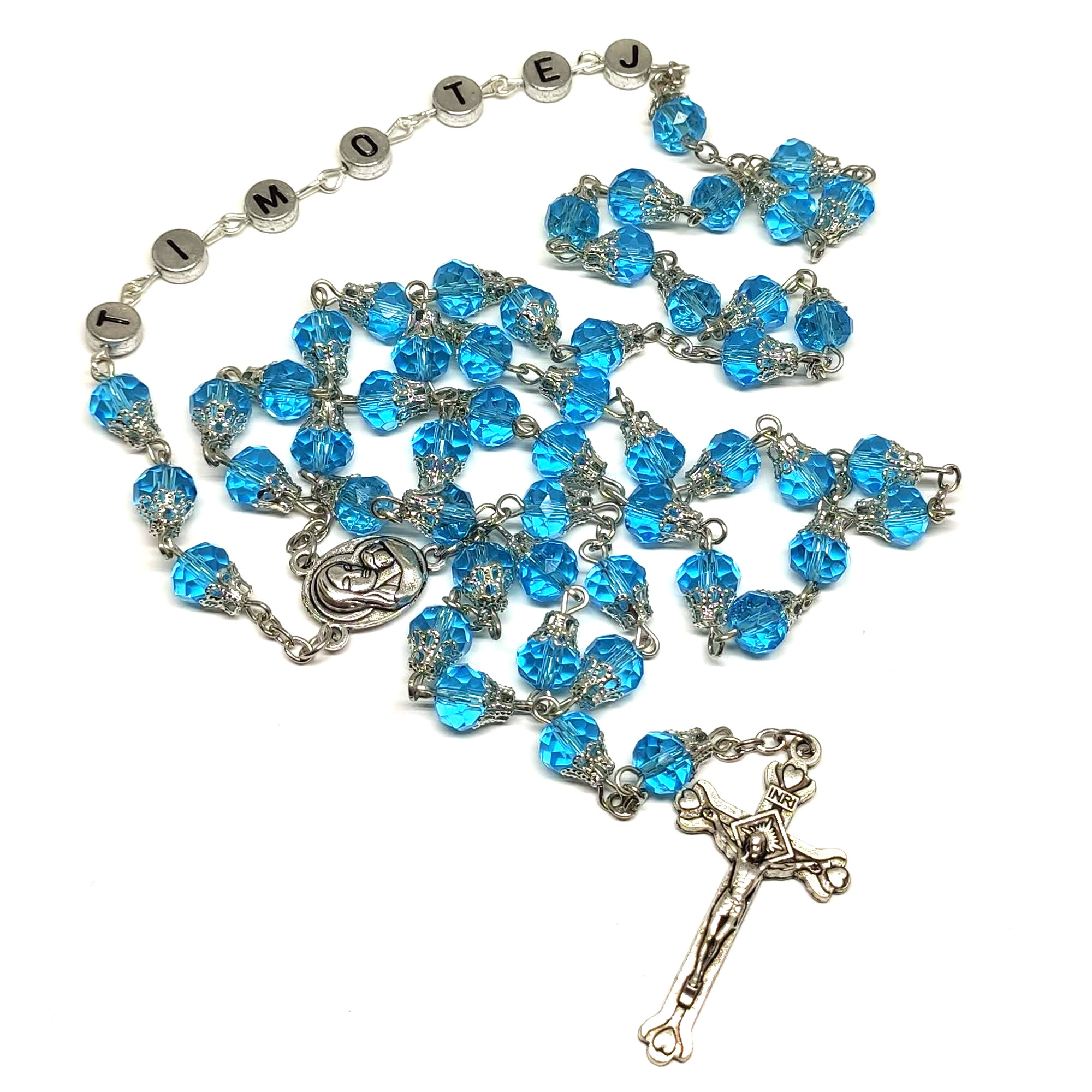 Ruženec, pospájané korálky modrej farby so striebornou ozdobou. Z ruženca visí krížik Ježiša krista. Podľa želania Vám vieme vyrobiť ruženec aj na mieru podľa zvolených korálok, ktoré si vyberiete. Na jeden ruženec je možné vyrobiť vždy iba jedno meno alebo meno s číslicami podľa typu korálok.