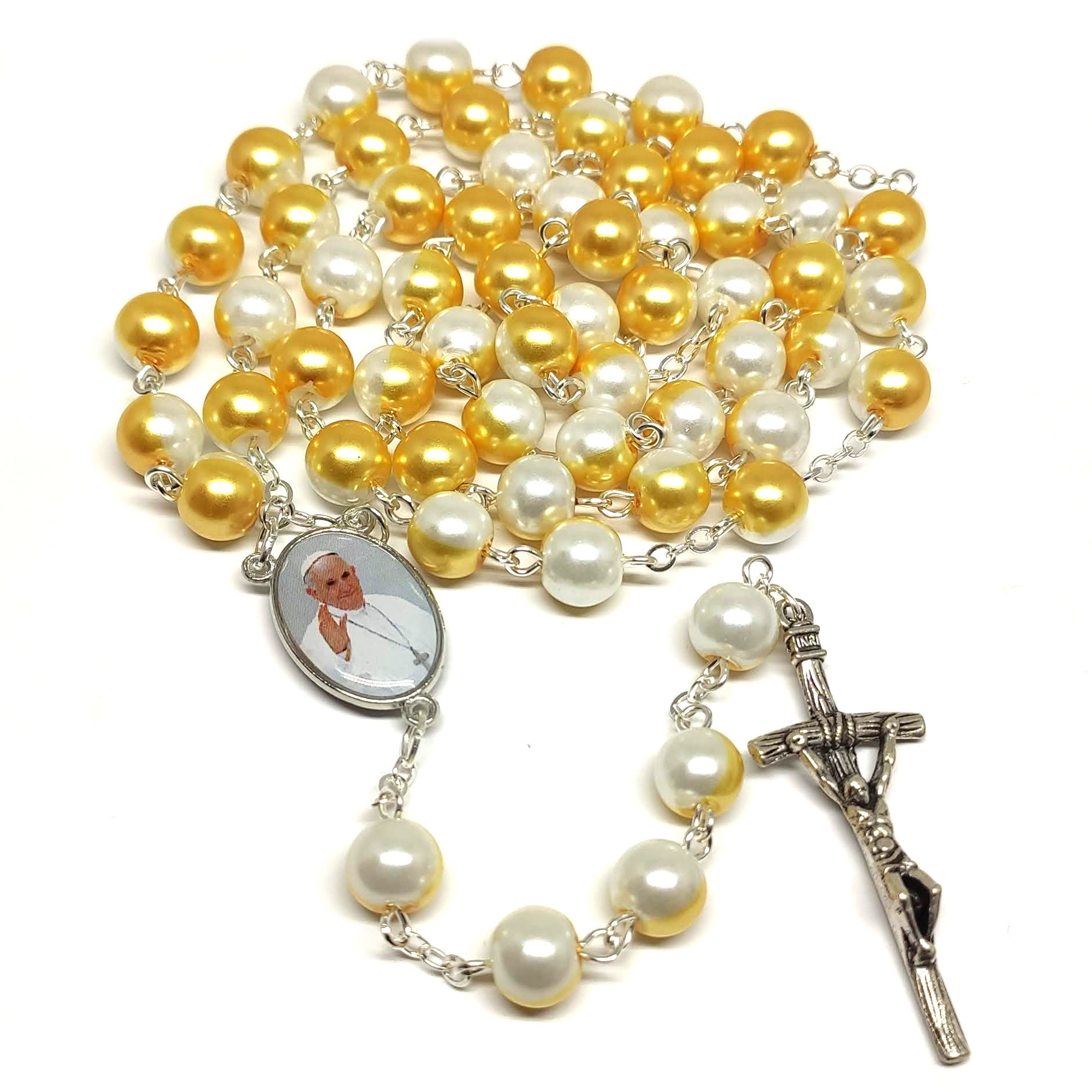 Prekrásny ruženec vo farbách Vatikánu, ktorý je pospájaný syntetickými perlami. V spodnej časti ruženca visí medailón Pápeža Františka a krížik Ježiša Krista.  Podľa želania Vám vieme vyrobiť ruženec aj na mieru podľa zvolených korálok, ktoré si vyberiete. Na jeden ruženec je možné vyrobiť vždy iba jedno meno alebo meno s číslicami podľa typu...
