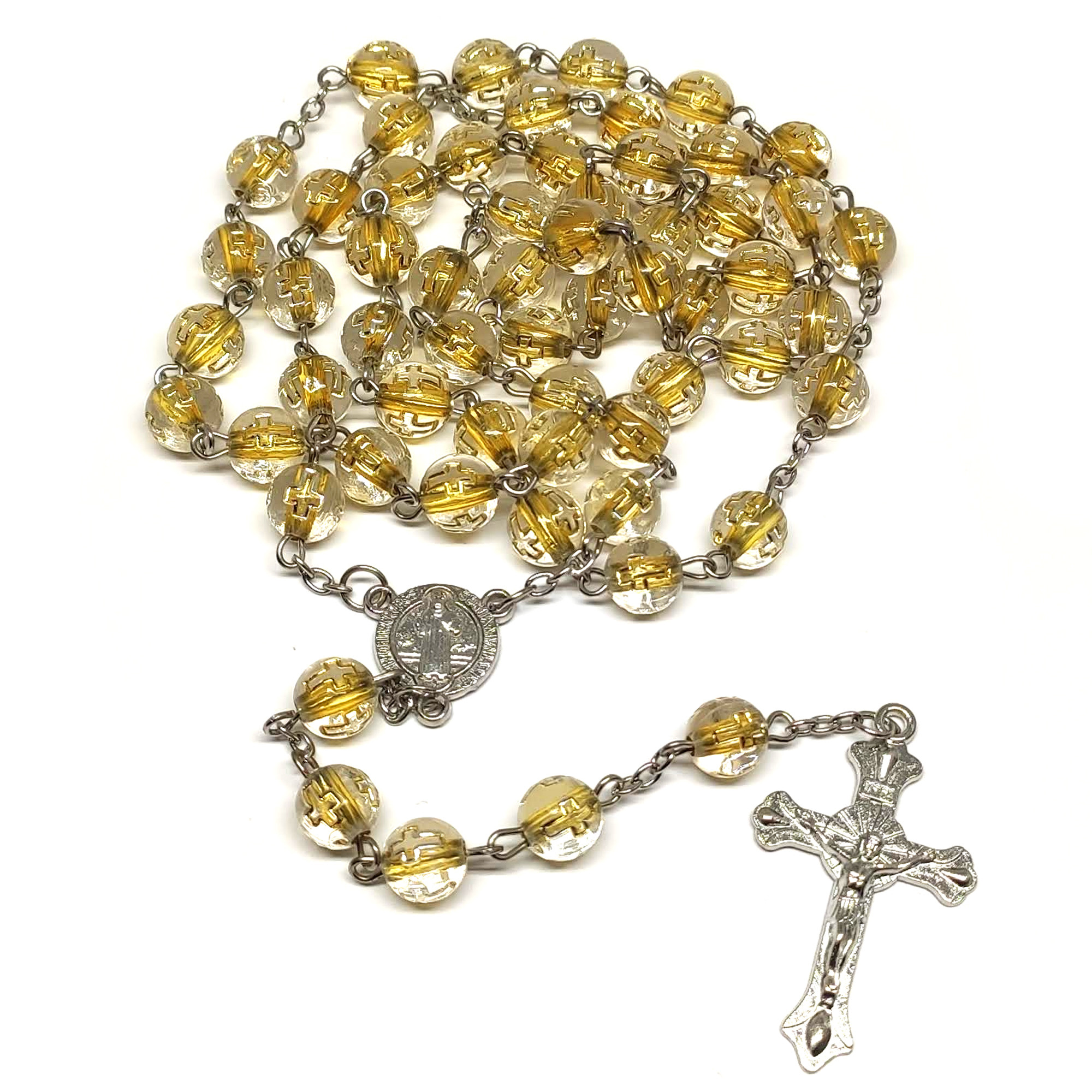 Ruženec s menom priehľadno-zlatý s Benediktínskou medailou