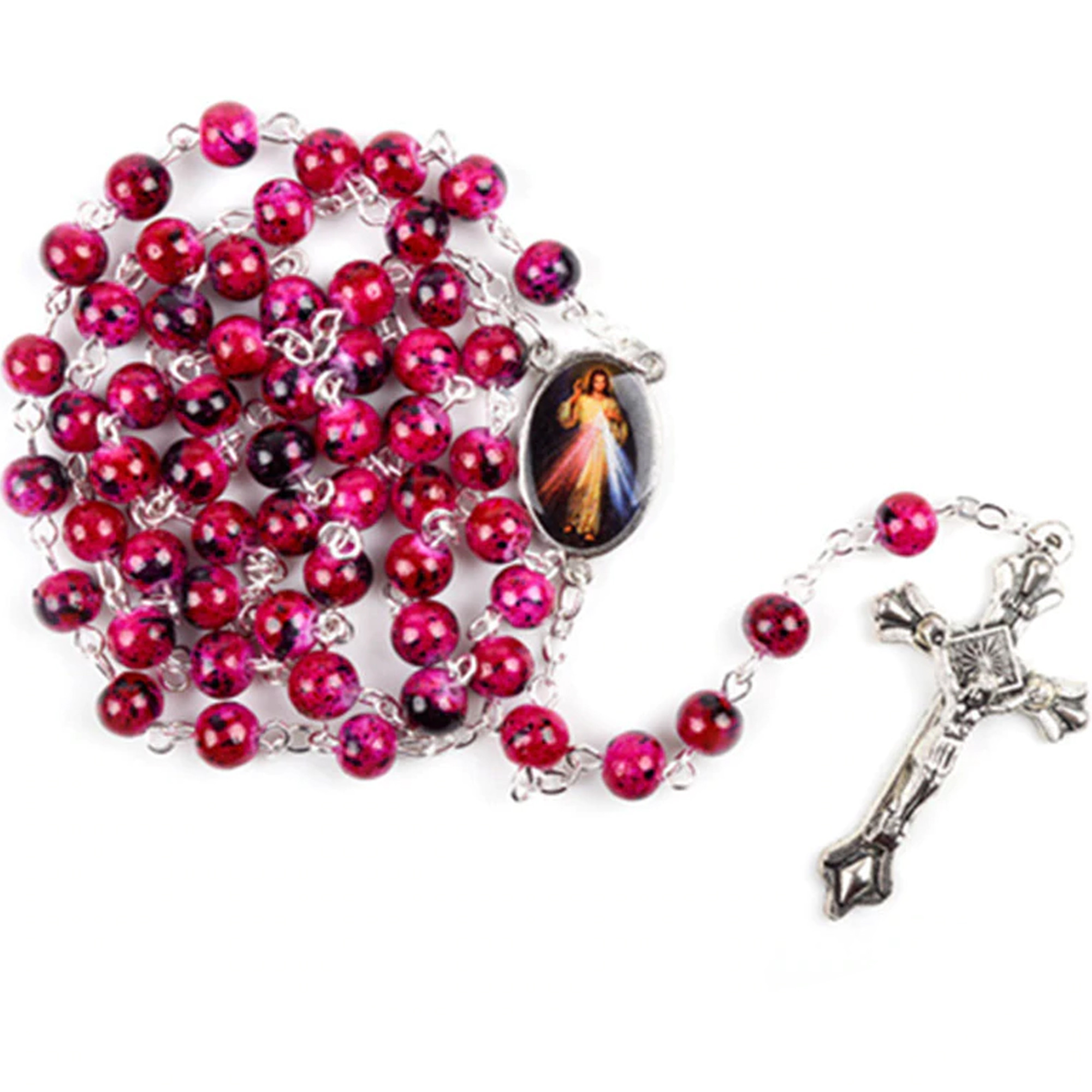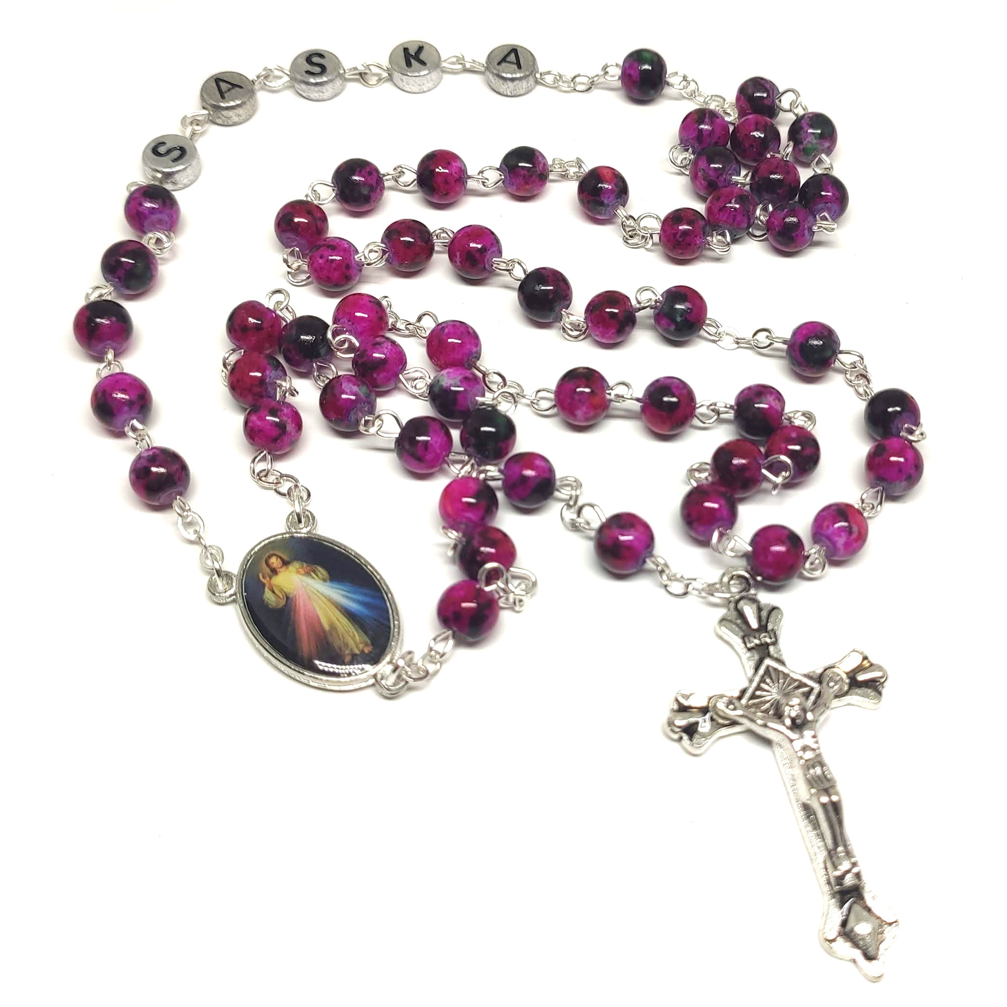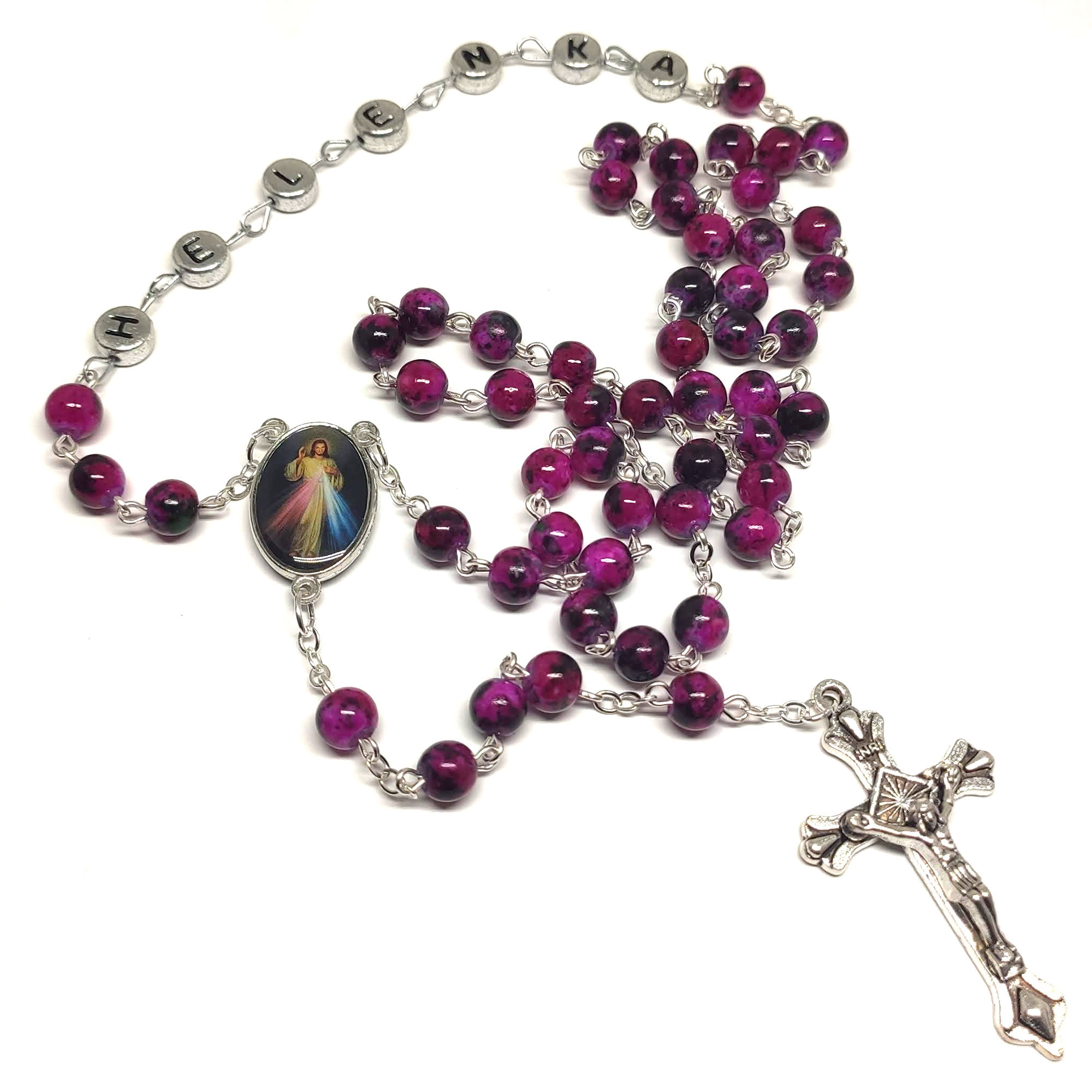 Postriebrený ruženec, ktorý je pospájaný korálkami ružovej farby. V spodnej časti ruženca visí medaila Božieho milosrdenstva a krížik Ježiša Krista. Podľa želania Vám vieme vyrobiť ruženec aj na mieru podľa zvolených korálok, ktoré si vyberiete. Na jeden ruženec je možné vyrobiť vždy iba jedno meno alebo meno s číslicami podľa typu korálok.