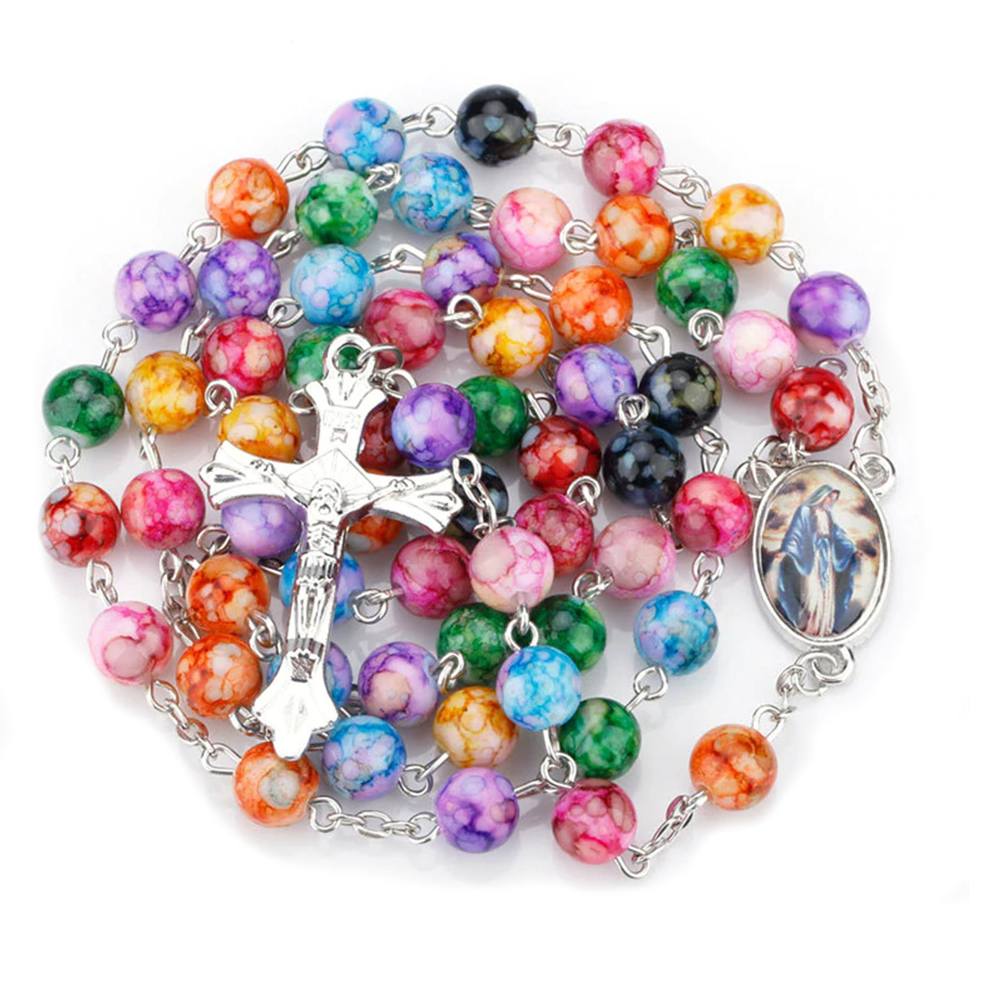 Náhrdelník ruženec, ktorý je pospájaný farebnými trblietkovými...