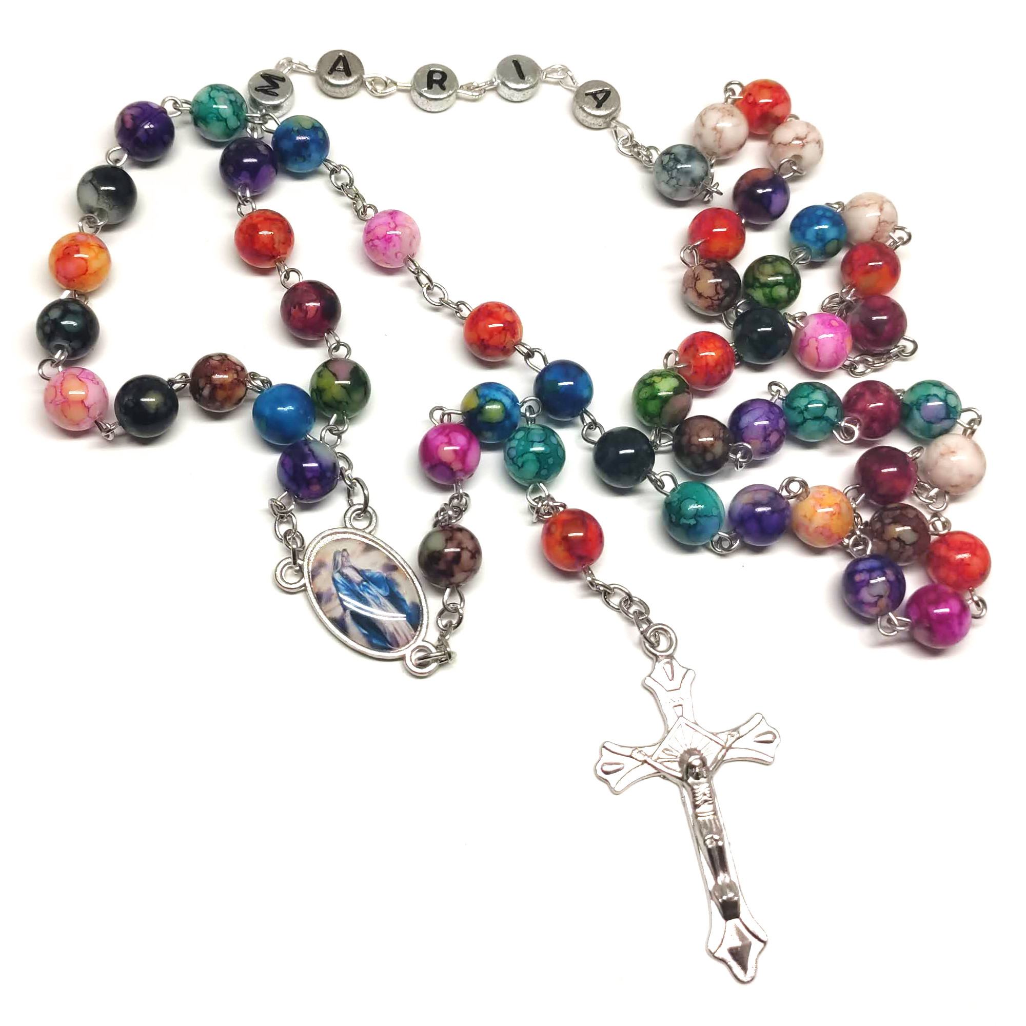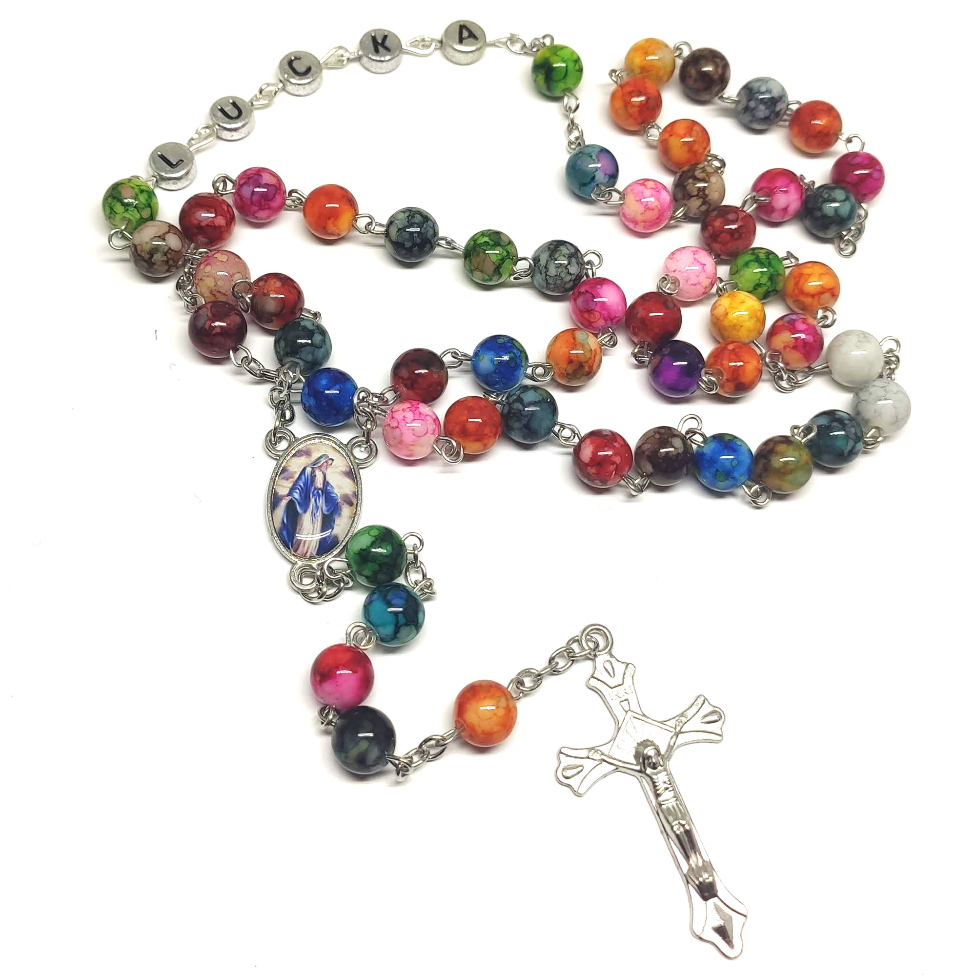 Ruženec, pospájané farebné korálky, na každom zrnku je strieborný...