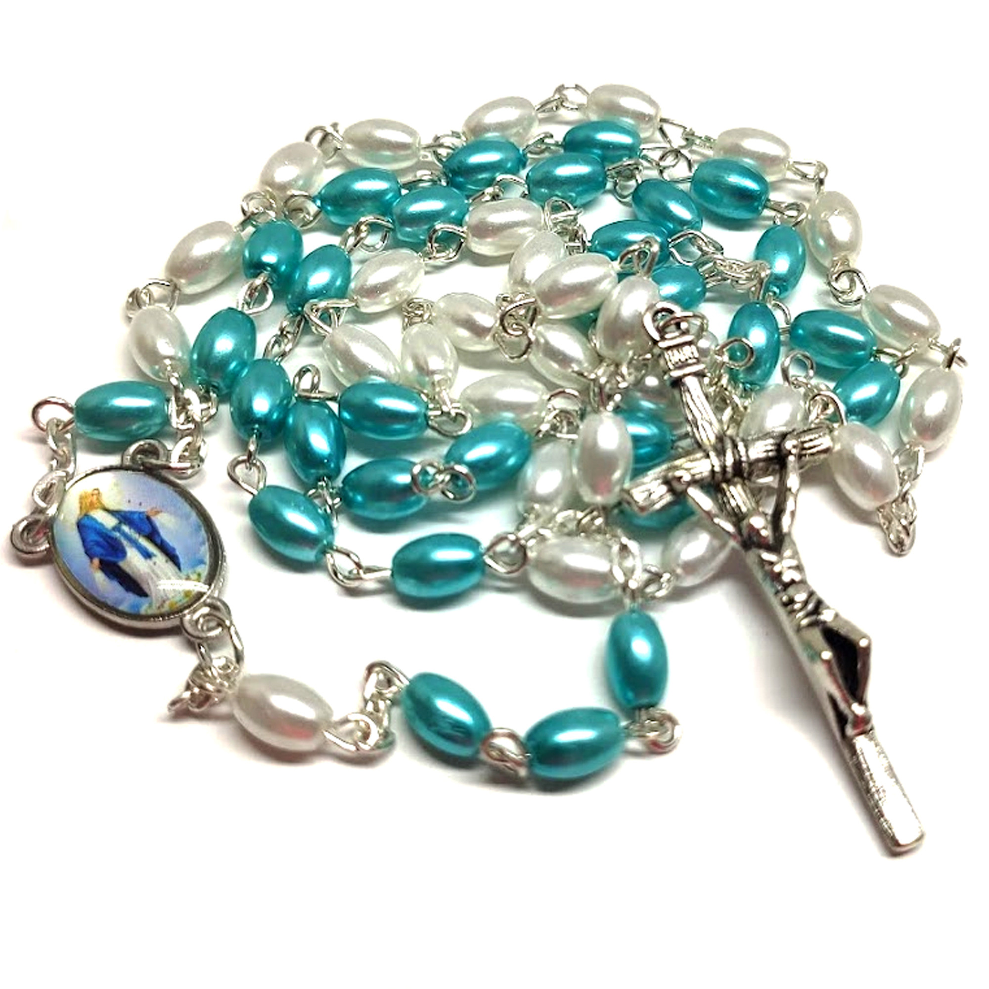 Ruženec, pospájané syntetické perly tyrkysovej a bielej farby. Z ruženca visí medailón Zázračnej Panny Márie a krížik Ježiša Krista.  Podľa želania Vám vieme vyrobiť ruženec aj na mieru podľa zvolených korálok, ktoré si vyberiete. Na jeden ruženec je možné vyrobiť vždy iba jedno meno alebo meno s číslicami podľa typu korálok.