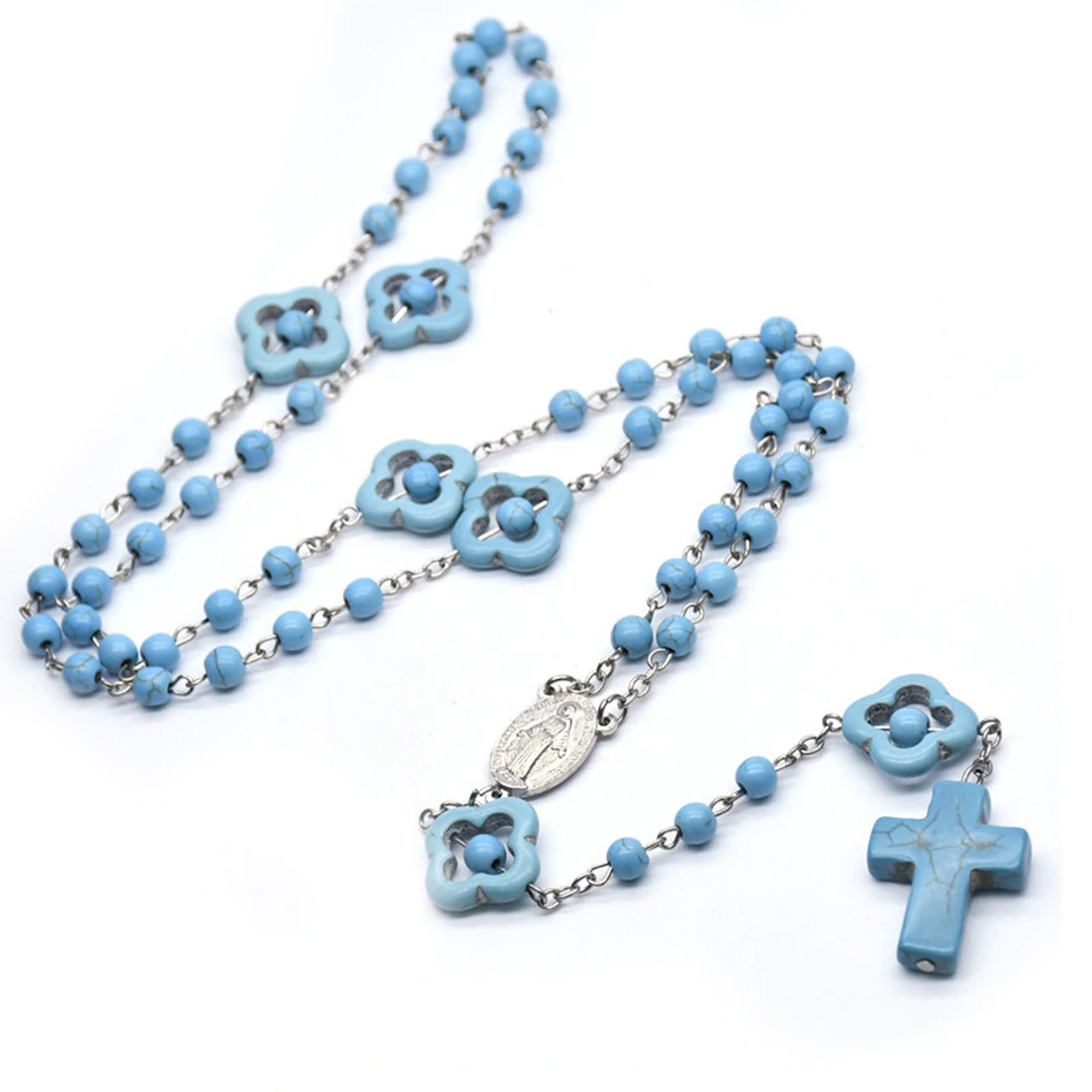 Postriebrený ruženec, ktorý je pospájaný korálkami modrej farby s...