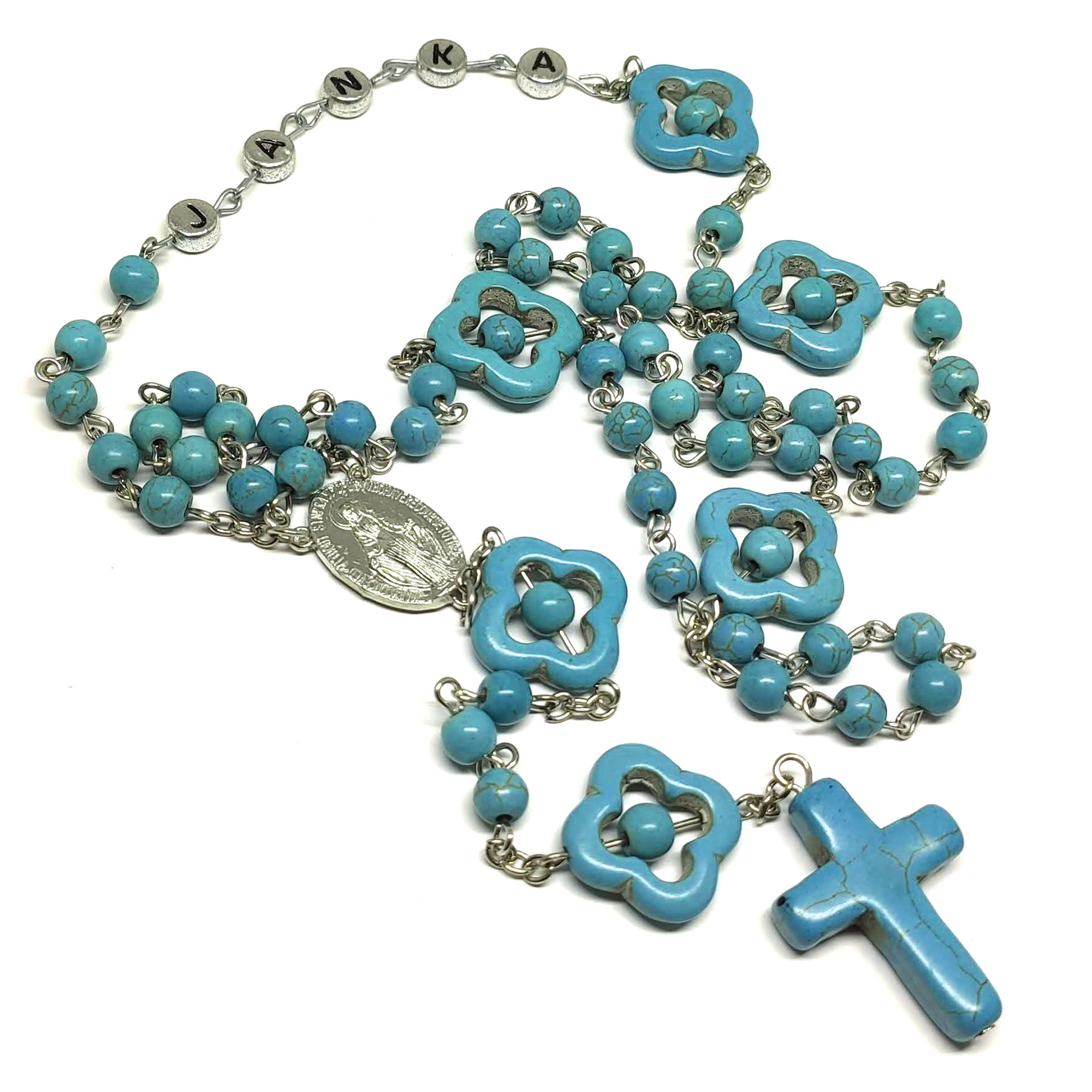 Postriebrený ruženec, ktorý je pospájaný modrými korálkami. V...