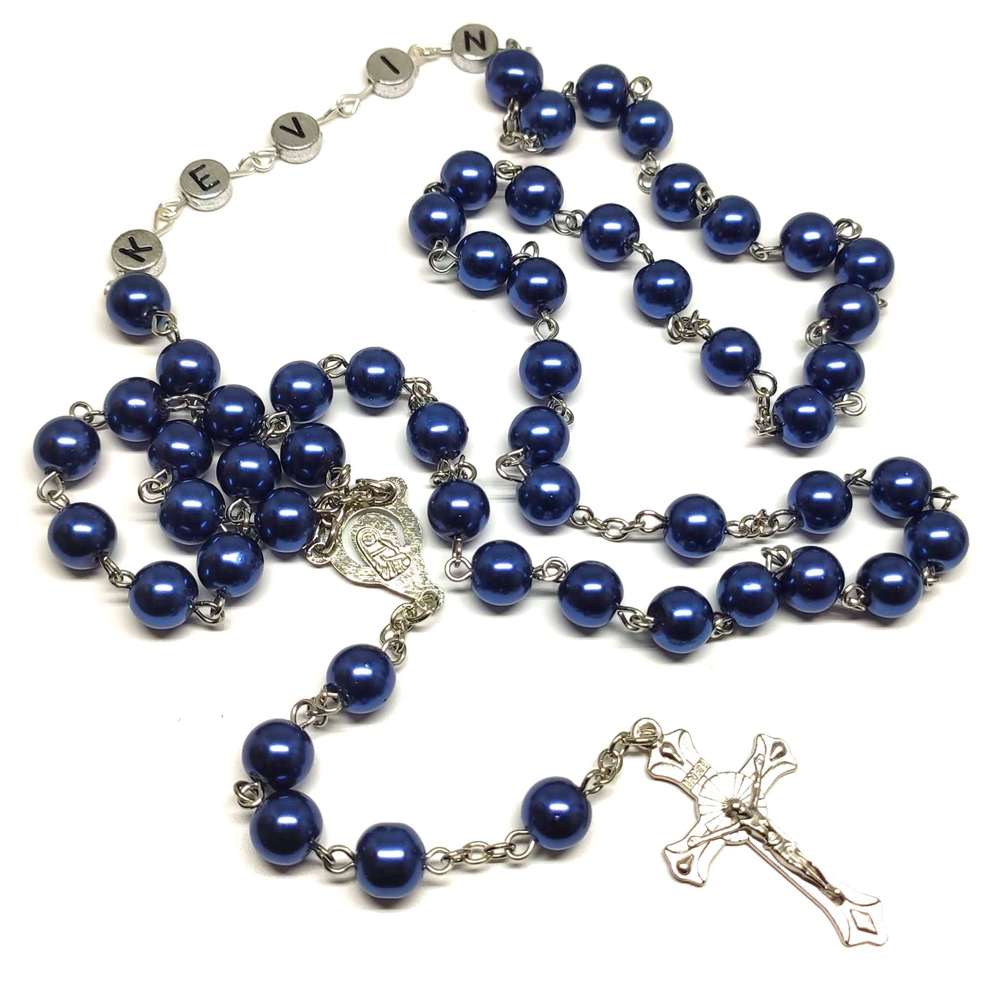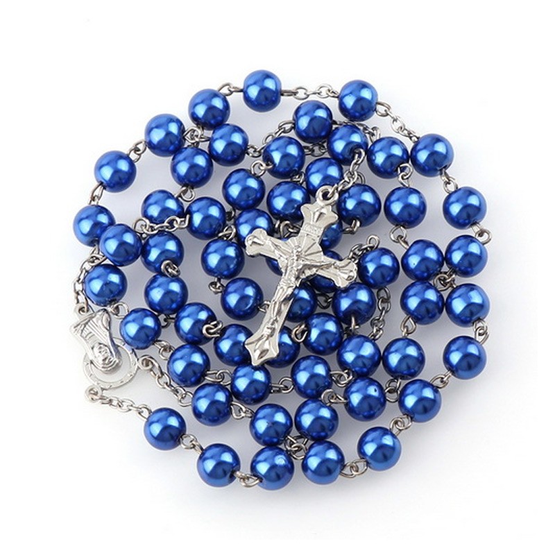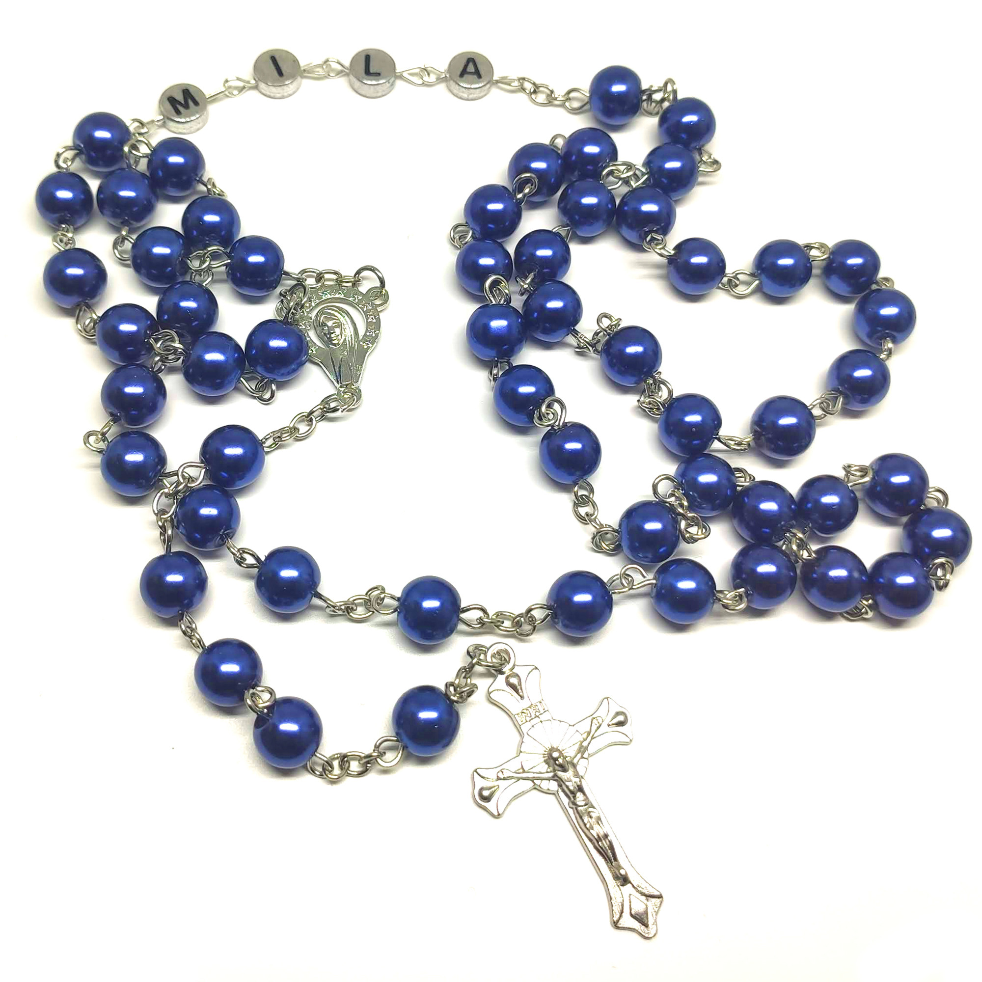Ruženec, ktorý je pospájaný imitáciou perál modrej farby. V spodnej...