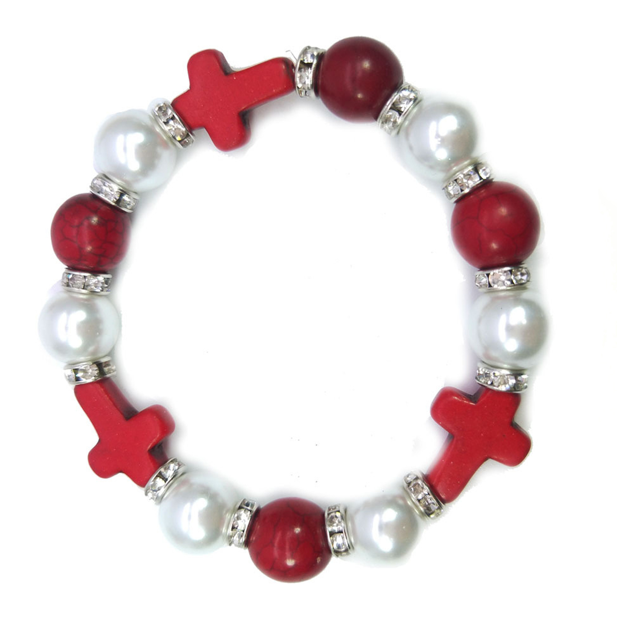 Náramok, pospájaná biela syntetická perla s červeným tyrkysom. Guličky oddeľujú biele kamienky, ktoré ho robia vskutku prekrásnym.  Náramok je na gumičku, takže ho jednoducho prevlečiete cez ruku.