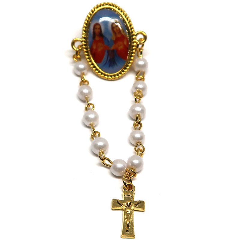 Pozlátená brošňa s vyobrazením sv.Jozefa a zázračnej panny Márie. Krásny a jedinečný šperk, z ktorého visí na retiazke krížik. Retiazku zdobia syntetické perličky bielej farby. Brošňa je vhodná aj ako darček pre veriaceho človeka.
